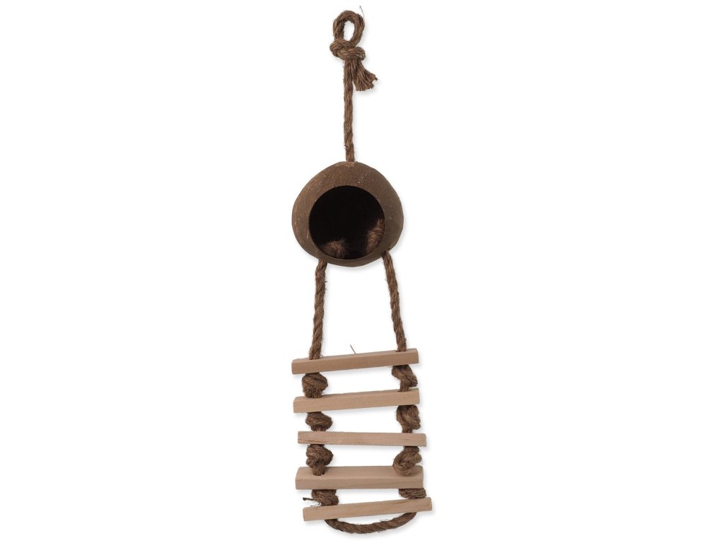 Závěsná budka z kokosu s dřevěným žebříkem na laně vhodná pro drobné exotické ptactvo. Vyrobeno z topolového dřeva, kokosu a sisalu.