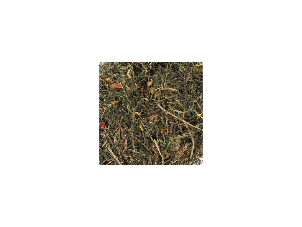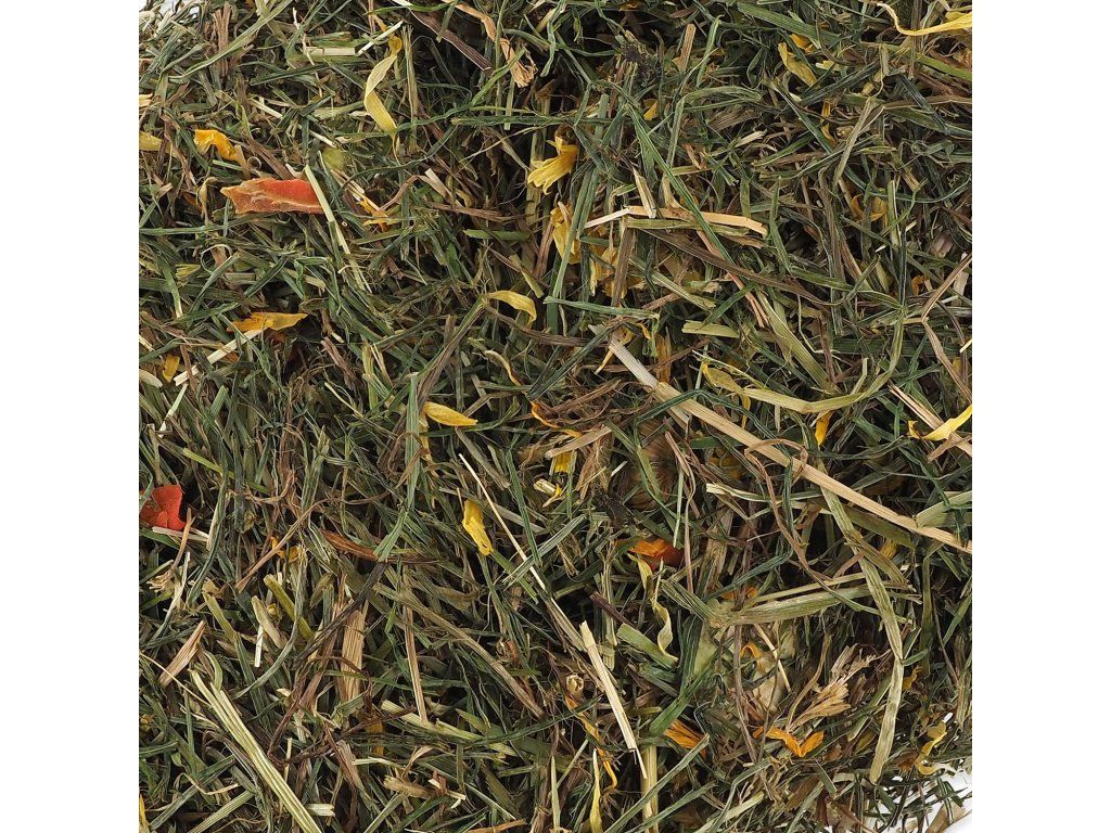 Složení: seno z horských luk 75 %, sušené květy měsíčku lékařského 15 %, hrachové vločky 5 %, sušená mrkev 5 %.