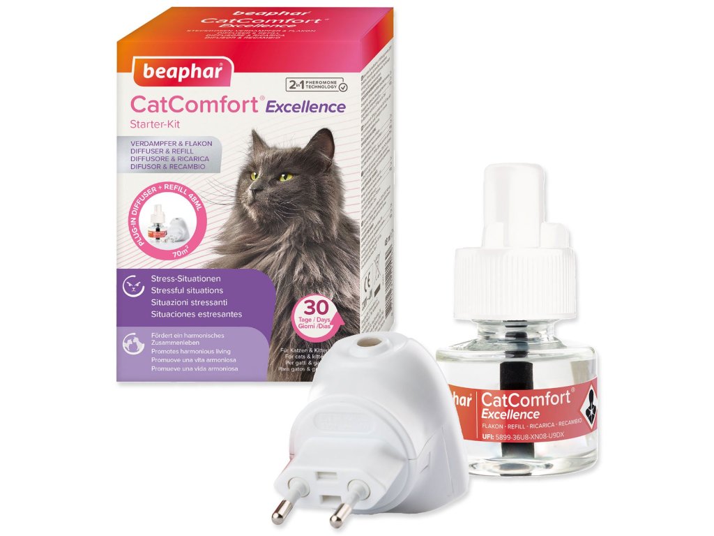 Sada s difuzérem CatComfort pomáhá uklidnit vaši kočku a snížit projevy jejího nežádoucího chování jako je například mňoukání, ničení nábytku, značkování nebo pocity strachu a úzkosti.