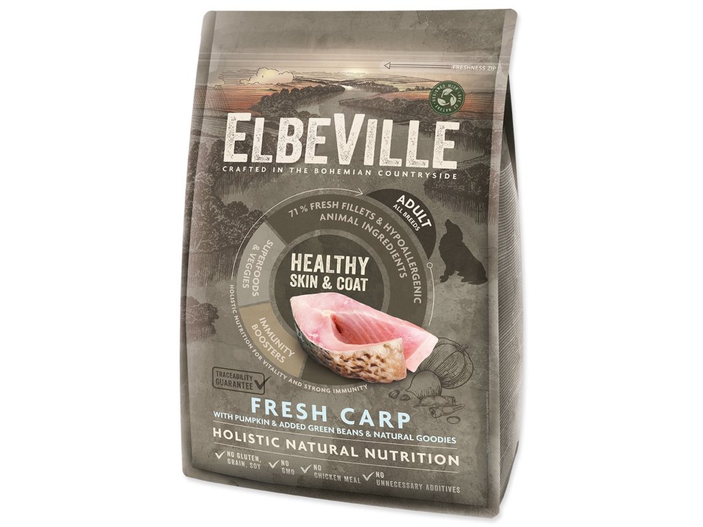 ELBEVILLE je přirozená strava pro celkové zdraví Vašeho psa. Je vyrobená z nejlepších přírodních, lokálních surovin včetně tzv. superpotravin a s vysokým obsahem kvalitního čerstvého masa. Tato receptura obsahuje 35 % čerstvých vykostěných filetů z kapra a dále 28 %
