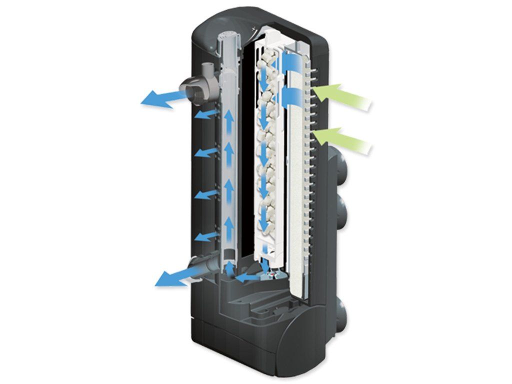 Maximální cirkulace vody a jejího okysličení dosáhnete nastavením na horní výstup, vestavěný Sprey Bar poskytuje jemný, rovnoměrný tok pro osázené nádrže, ve kterých je nežádoucí silný proud a dolní výstup je ideální pro promíchání vody v hloubce akvária. Filtr je dodáván s filtračnímy médii -2 pěnové podložky, 2 Poly / Carbon vložky, a Biomax biologické kroužky.