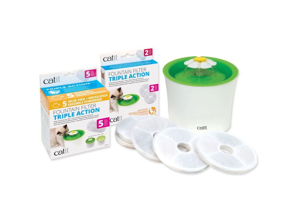 Filtr Catit Triple Action odstraňuje hořčík a vápník z vodovodu (2). Tyto minerály se mohou hromadit ve spodním močovém traktu vašeho domácího mazlíčka a vést k onemocněním močových cest, což je běžný zdravotní problém u koček. Navíc tento vysoce výkonný filtr odstraňuje pachy a bakterie (1) chlóru a zachovává tmavé chloupky, sedimenty a jiné zbytky (3).