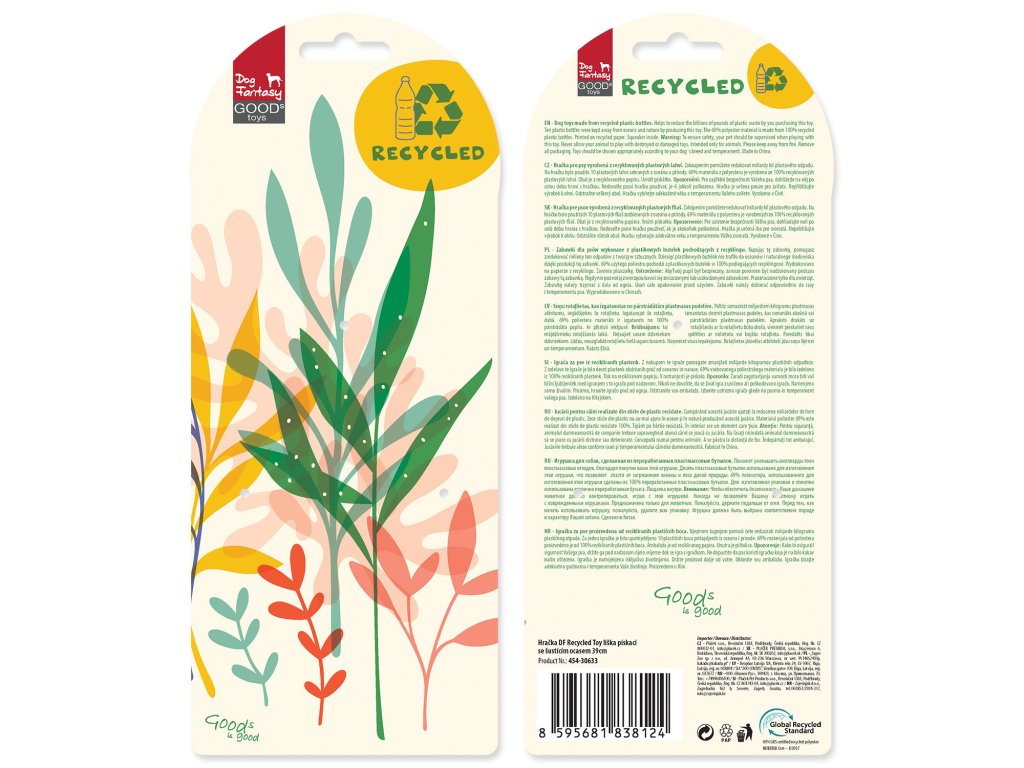 Dog Fantasy Recycled Toy se šustícím ocasem je vyrobena z 69% polyesteru získaného ze 100% recyklovaných plastových lahví, čímž pomáhá snižovat miliardy kil plastového odpadu, které končí v oceánech a v přírodě. o psy všech plemen. Ať už je vaším čtyřnohým kamarádem malý štěně nebo velký dospělý pes, tato hračka je pro něj ideální volbou.