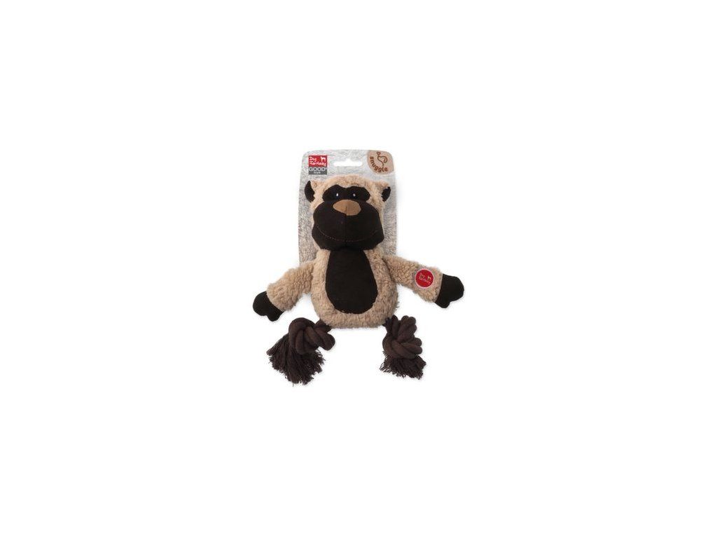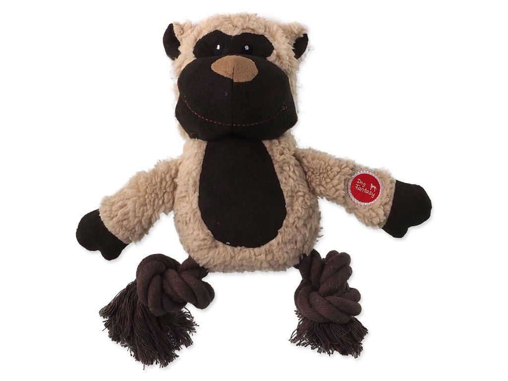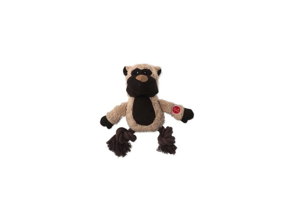 Plyšová hračka ve tvaru zvířátka s provázkovými nohami.
