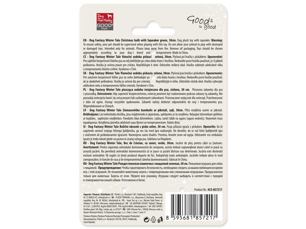 Hračka Dog Fantasy Winter Tale ozdoba vánoční pískací, zelená 30cm
