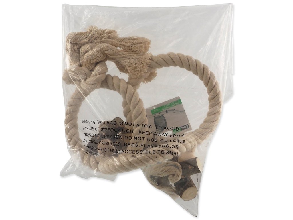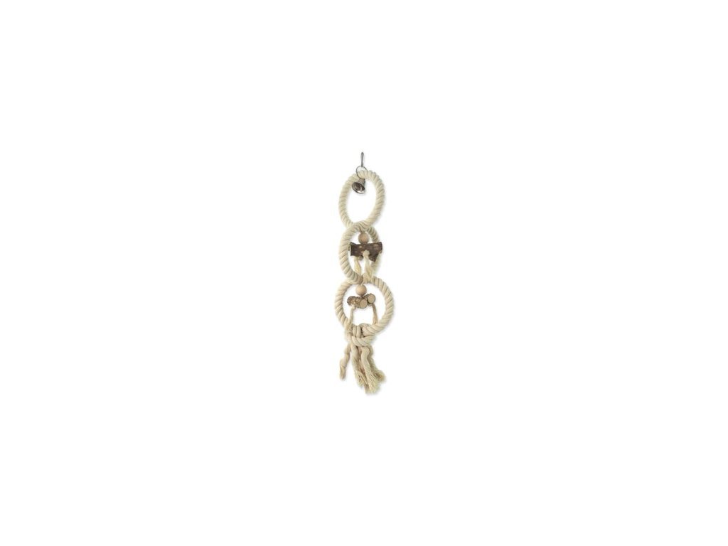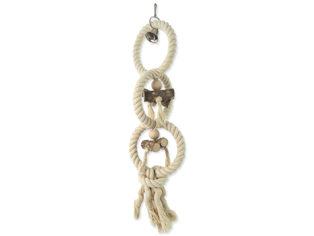 Závěsná hračka lanové kruhy se zvonečkem a dřívky vhodná pro střední a velké exotické ptactvo.
