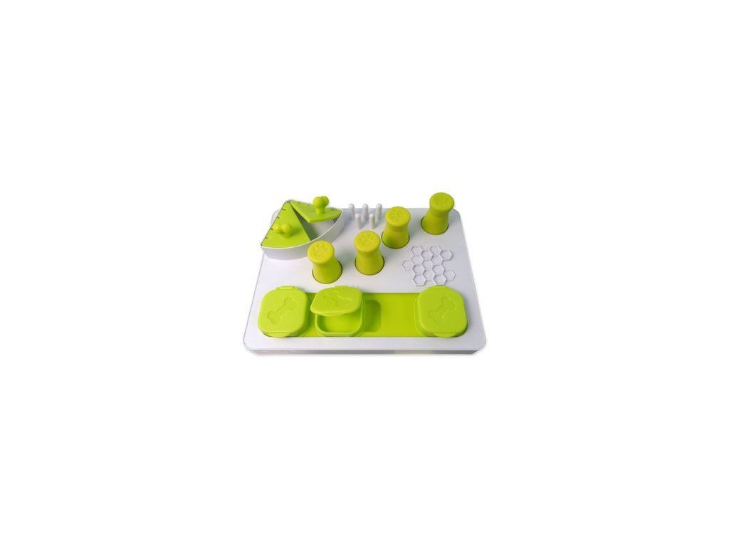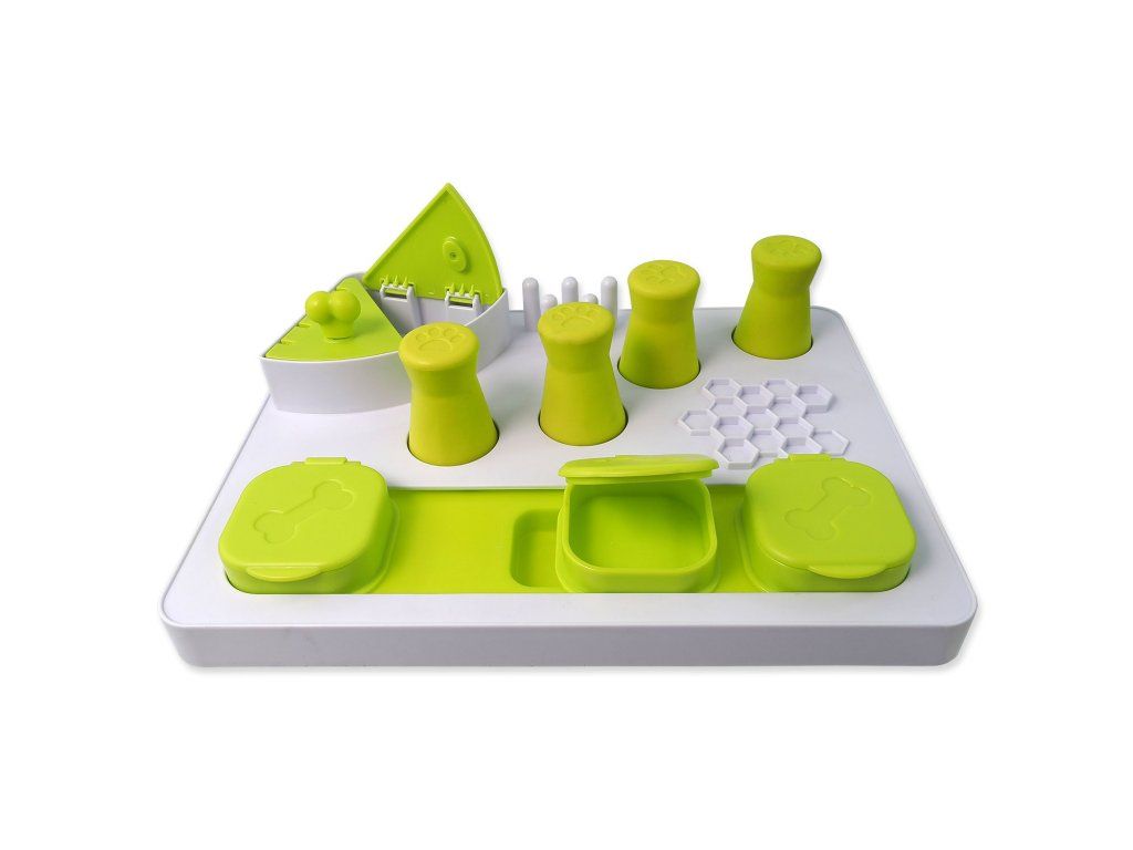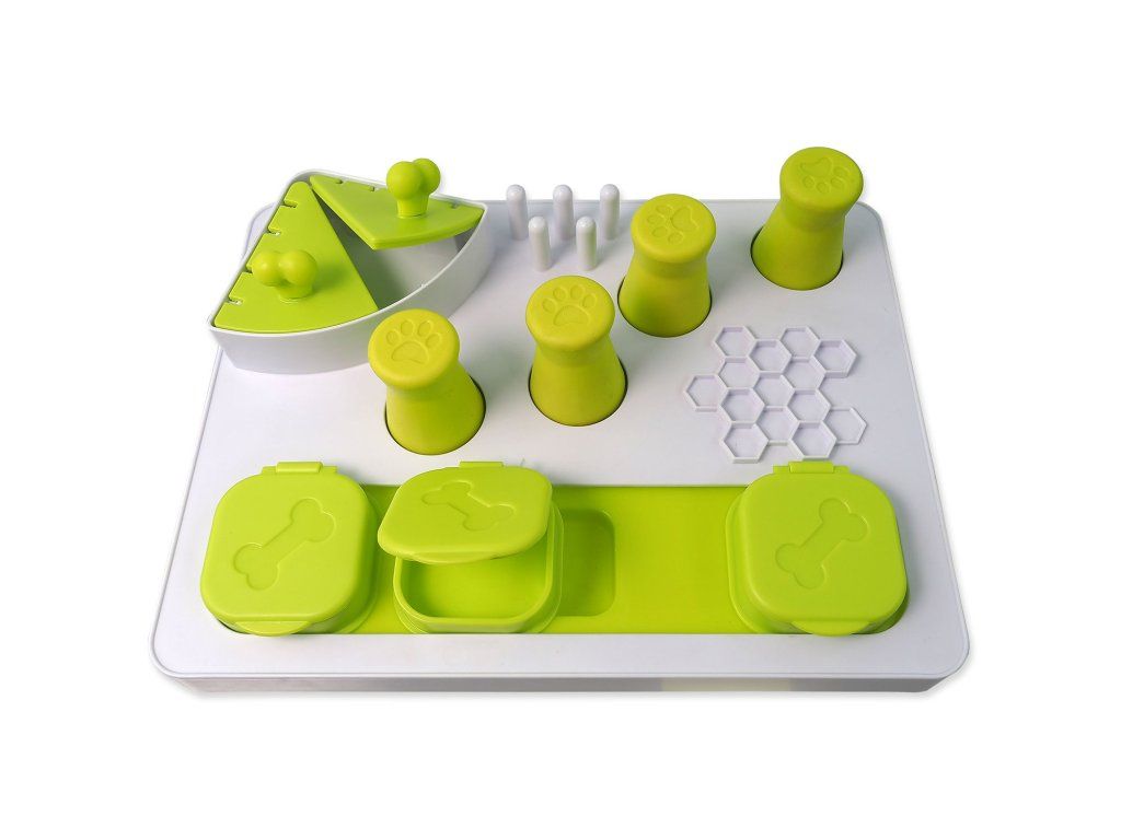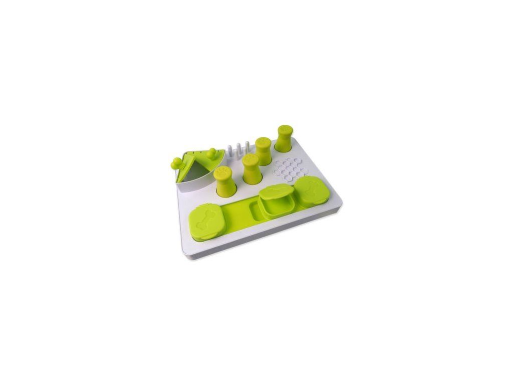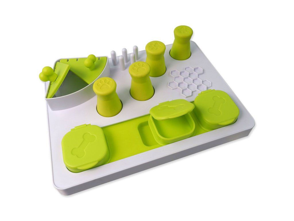 Schovejte granule nebo pamlsek do hračky a nechte psa si užít zábavu s hledáním. Pes může použít tlapu nebo čumák k posouvání plastových čtverců, jejich otevření nebo nadzvednutí částí hračky a získat tak pamlsek.
