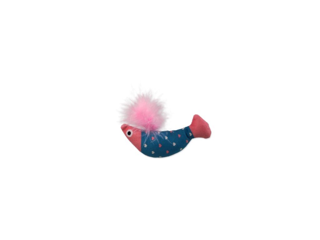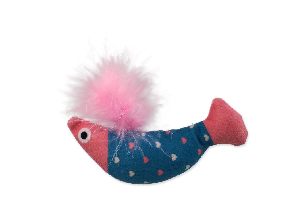 Hračka ve tvaru ryby s pírkem a šantou kočičí