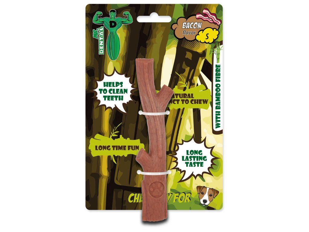 Žvýkací hračka Mr. Dental Bambone ve tvaru klacku se slaninovou vůní.
