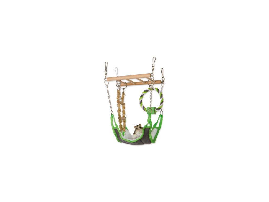 Závěsný žebřík s pelíškem a bavlněným kruhem sloužící jako místo pro odpočinek malých hlodavců.