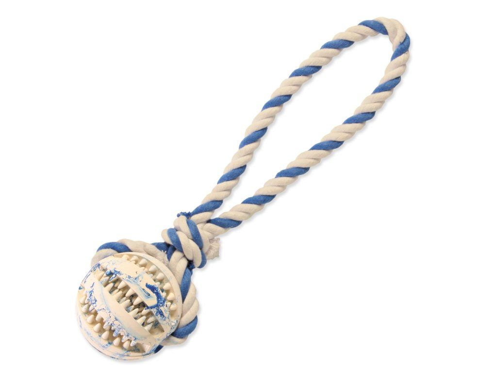 Hračka přetahovadlo pro psy. Speciální drážky na míčku masírují dásně a zároveň zabraňují tvorbě zubního plaku.
