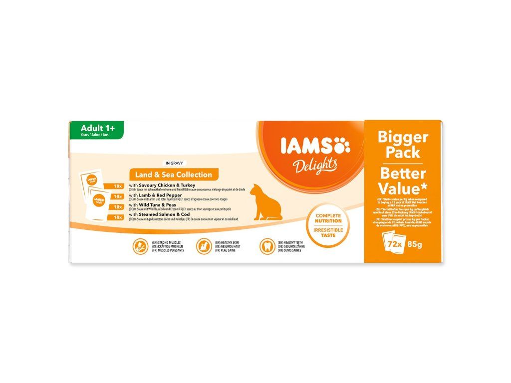 Pevninská a mořská kolekce IAMS Delights ve vlastní šťávě je 100% kompletní a vyvážené prvotřídní mokré krmivo pro dospělé kočky v praktickém balení multipack.