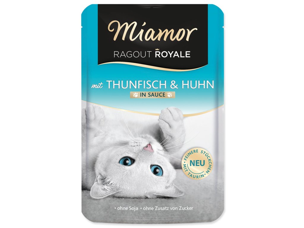 Jemné kousky v delikátní šťávě, gurmánský pokrm s tuňákem a kuřecím masem – zcela bez hovězího masa. Obohaceno o vitamíny.