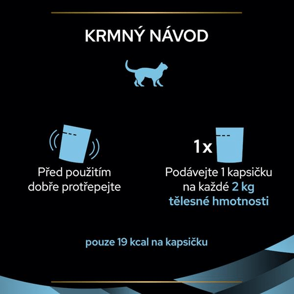 Doporučená dávka je 1 kapsička denně na každé 2 kg tělesné hmotnosti. Kočka by měla mít neustále k dispozici čerstvou pitnou vodu, protože kapsička podporuje hydrataci, ale plně ji nenahrazuje. Pro optimální účinek je důležité podávat kapsičku každý den, aby se přirozeně zvýšil celkový příjem tekutin a podpořilo zdraví močových cest.