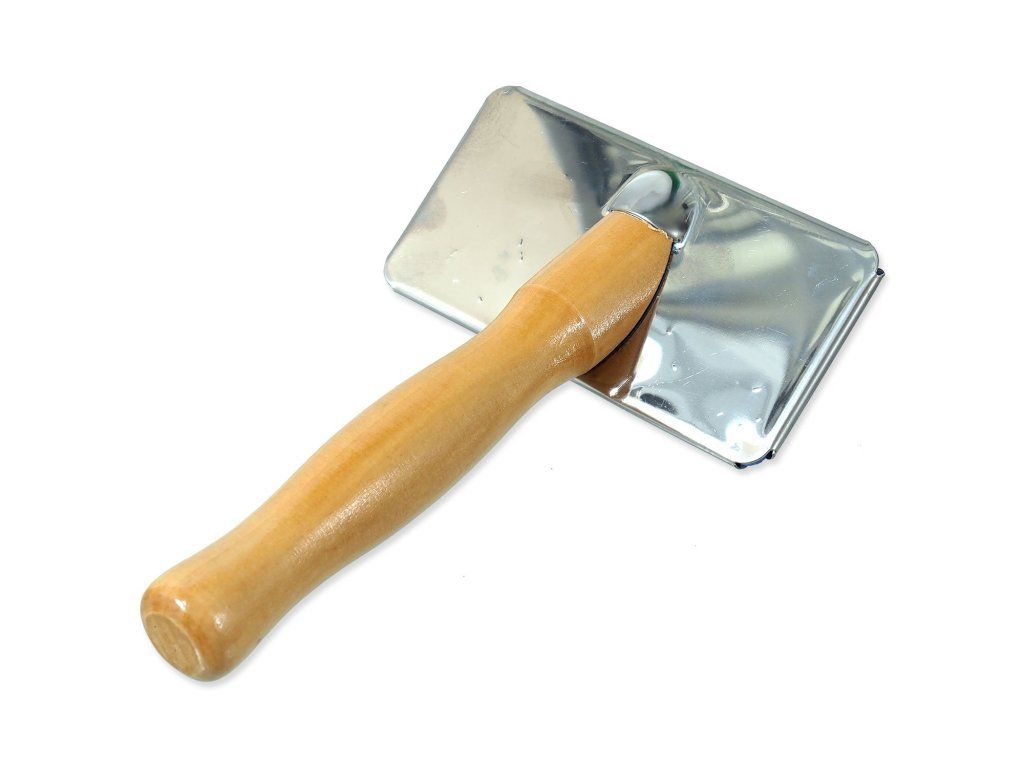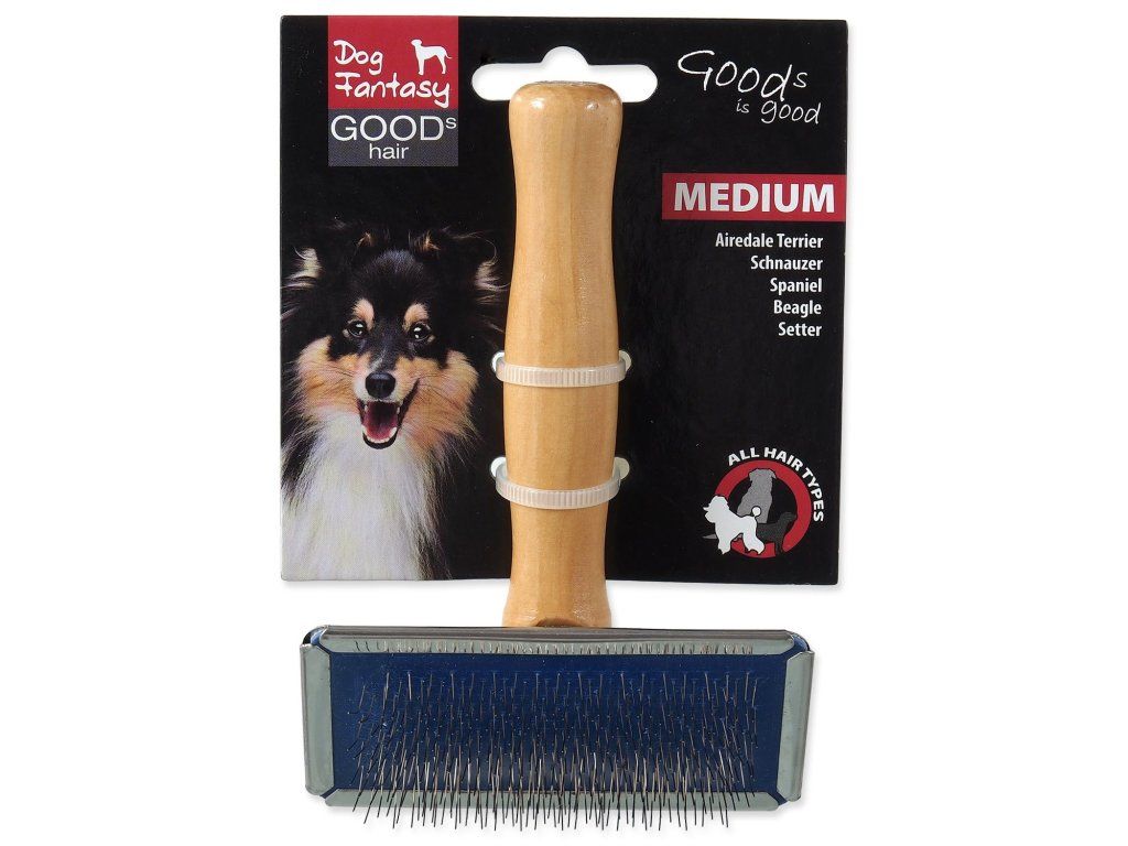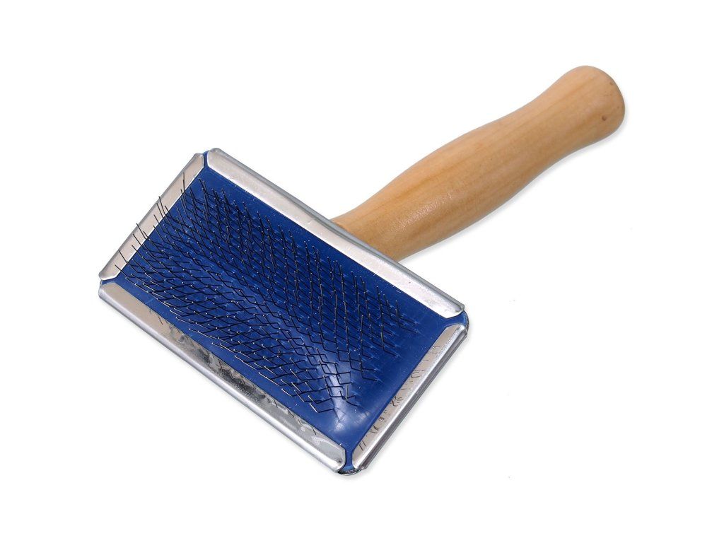 Kartáč s kovovými drátky a dřevěnou rukojetí pro střední psy.