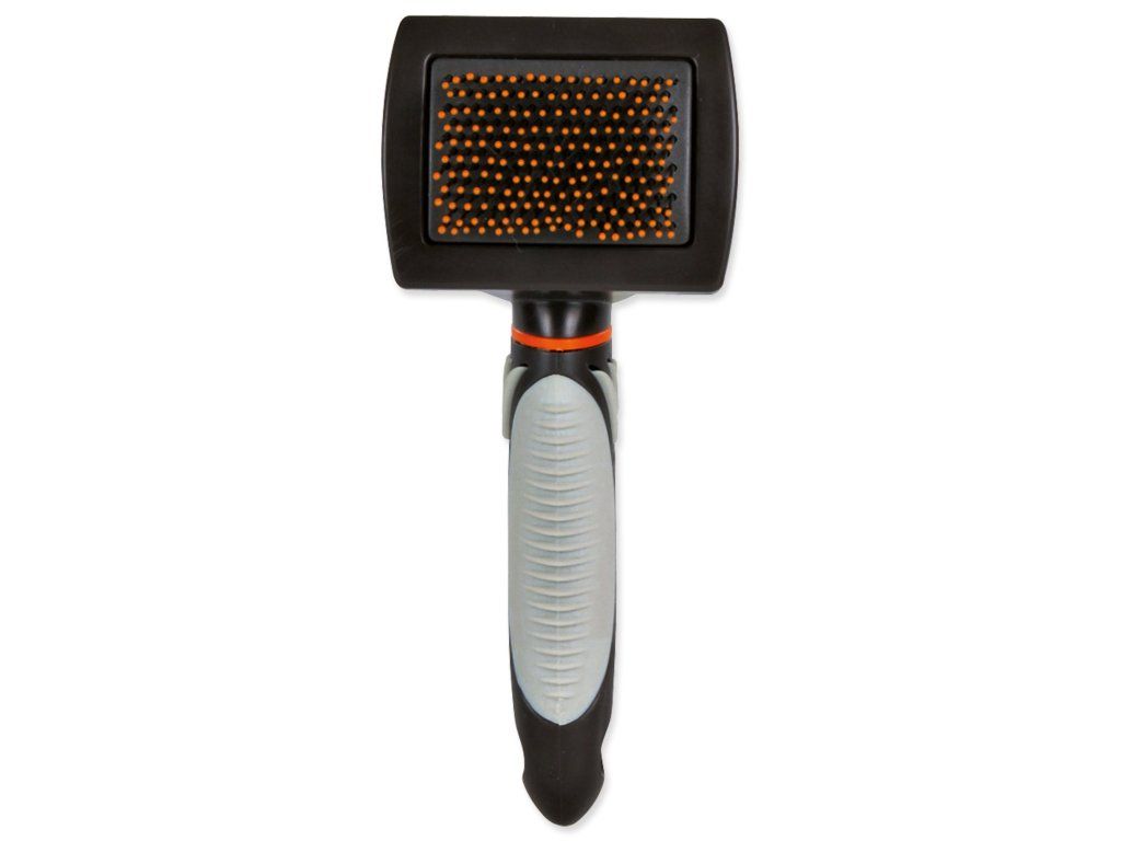 Plastový kartáč pro psy s extra měkkými štětinami s kuličkami. Vhodné pro krátkosrsté, dlouhosrsté a hrubosrsté psy. Kartáč má plastovou rukojeť s protiskluzovou gumou.