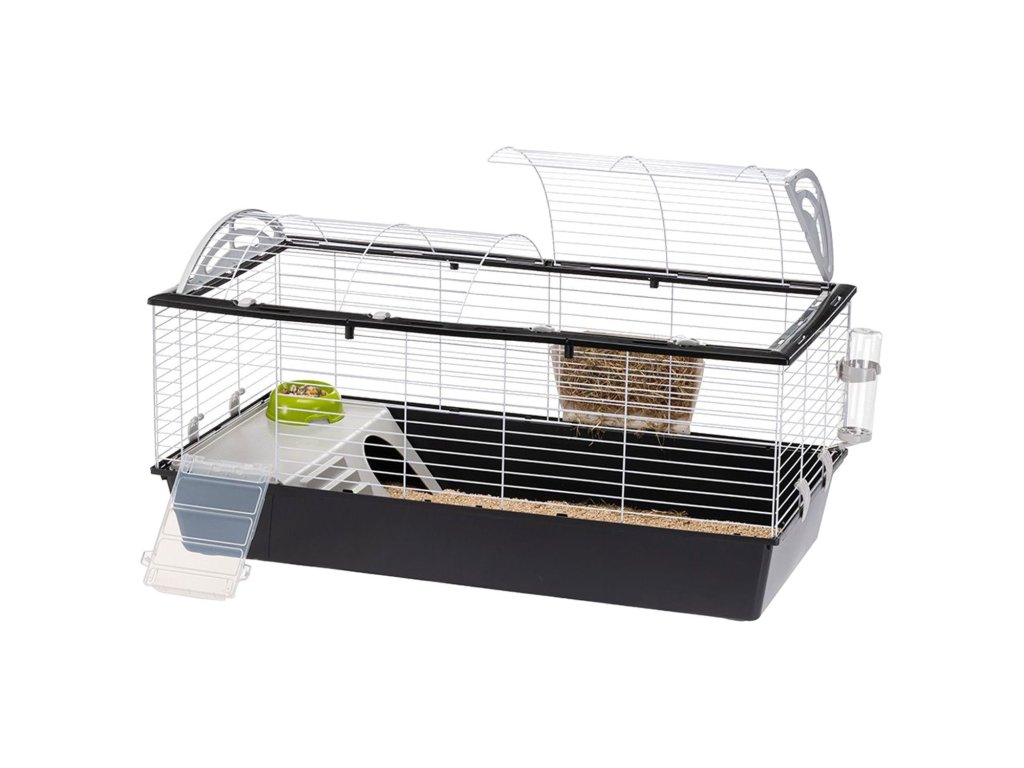 Je vybavena plastovým domečkem, napaječkou, miskou na krmení a jeslemi na seno.
