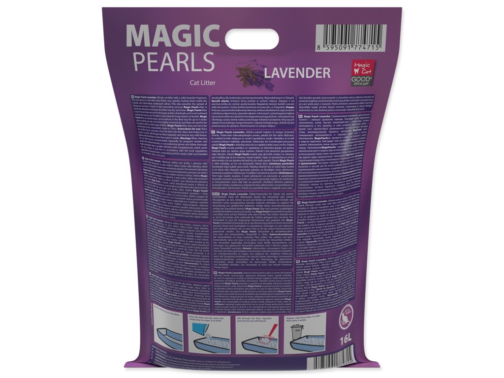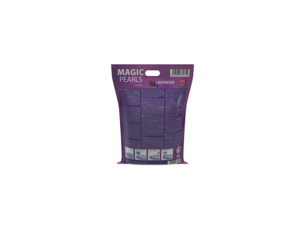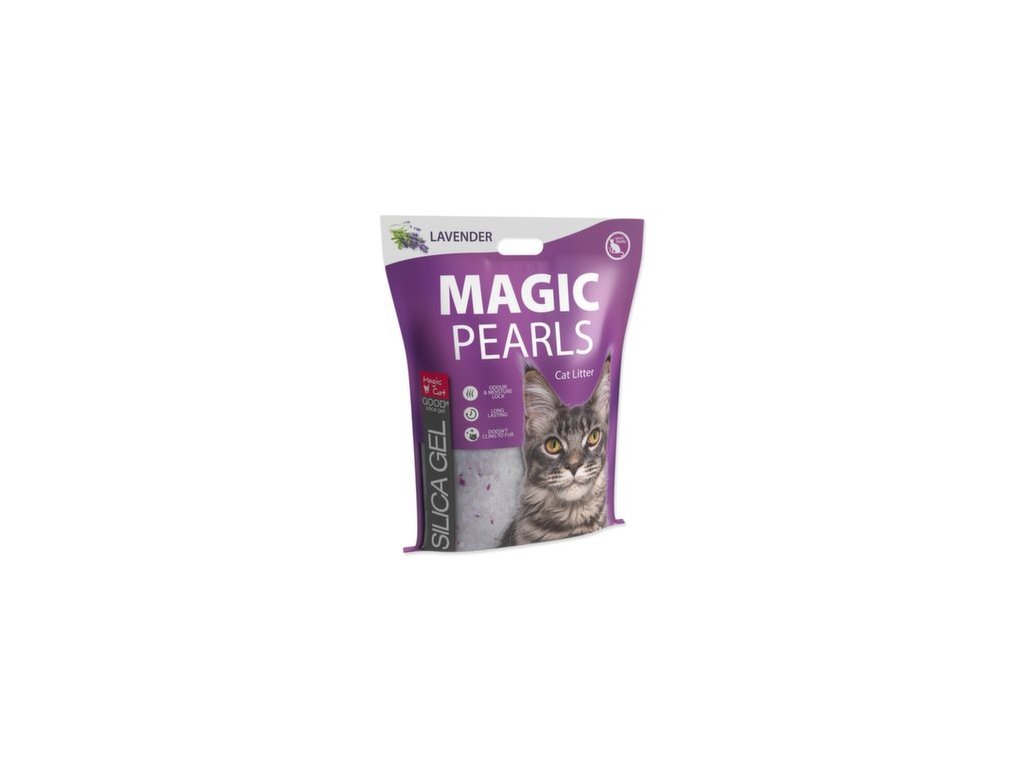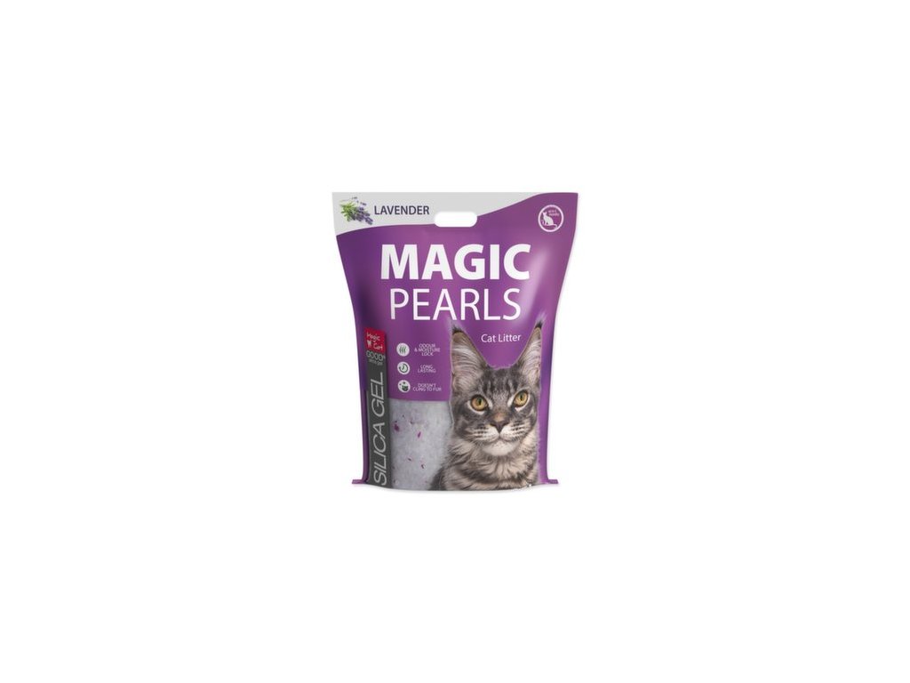 Silikátové stelivo pro kočky s jemnou vůní levandule. Díky mikropórům na sebe stelivo velice rychle váže tekutiny, které uzamkne uvnitř krystalků a eliminuje nepříjemný zápach. Tím zabraňuje množení nebezpečných bakterií. Díky tomuto inovativnímu procesu má stelivo Magic Pearls extrémní savost a udržuje toaletu suchou a čistou. Stelivo Magic Pearls je bezprašné a neulpívá na tlapkách a srsti zvířat, takže není kočkami vynášeno mimo toaletu. Stelivo je vhodné i pro dlouhosrstá plemena koček. Stelivo Magic Pearls v toaletě vydrží absorbovat pachy a vlhkost až 4 týdny (při použití jednou kočkou), proto je jeho použití také velice ekonomické, není třeba jej měnit tak často jako jiné druhy steliv.