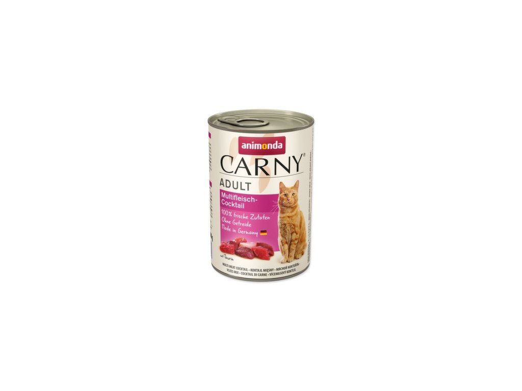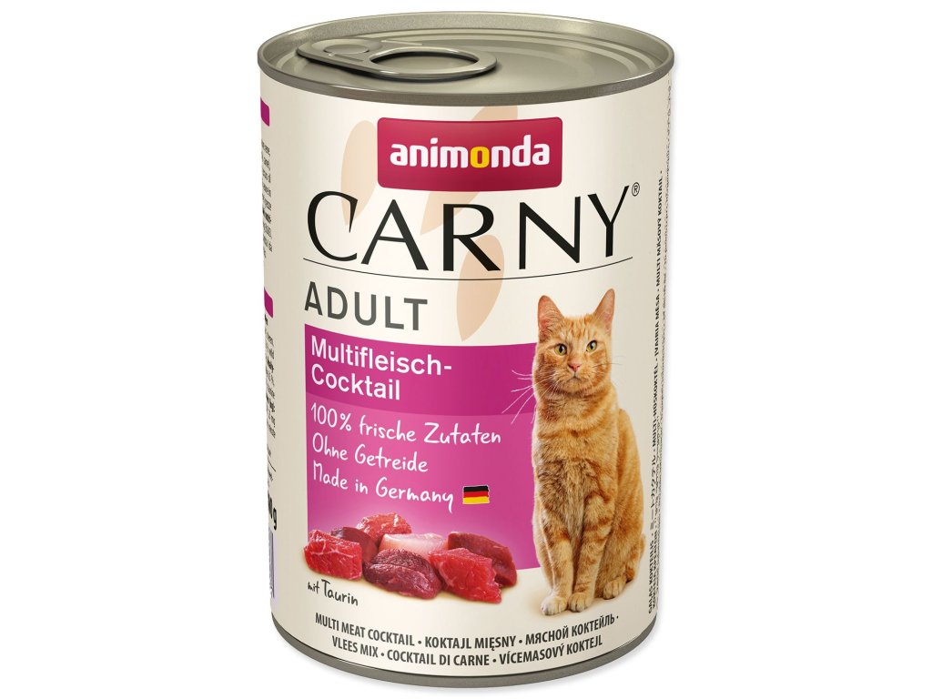 Konzerva s masovou směsí. Kompletní krmivo pro dospělé kočky.