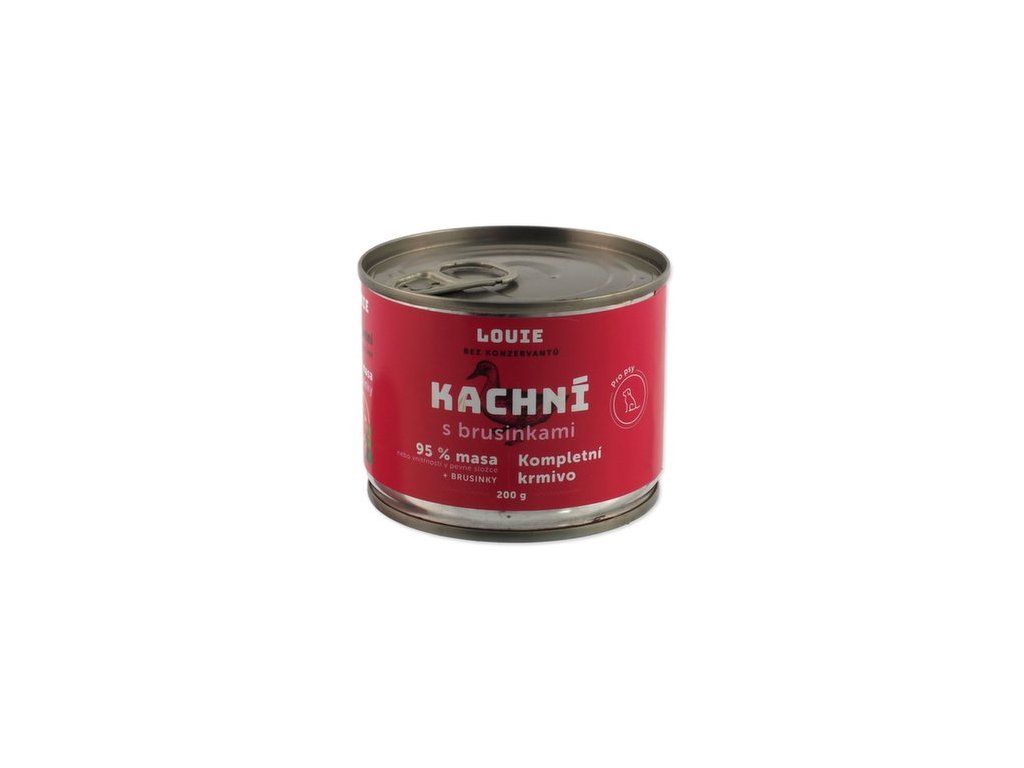 Kompletní krmivo pro psy všech plemen bez rozdílu věku. Šťavnatá konzerva obsahující 95 % mletého kachního masa v pevné složce. Kromě masa jsou v konzervě i změkčené kachní kosti, které jsou přírodním zdrojem vápníku a fosforu rovnou v přirozeném poměru a brusinky sloužící jako doplněk pro podporu peristaltiky střev a simulaci minoritní rostlinné složky v potravě psů. Mrkev dodává psům potřebné živiny a minerály a postará se o vstřebání šťávy, kterou maso během sterilace uvolní. Nemusíte se proto bát, že když byl váš pejsek zvyklý na granule, budete běhat na procházky častěji než obvykle.