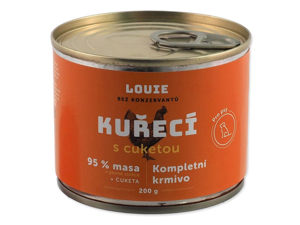 Kompletní krmivo pro psy všech plemen bez rozdílu věku. Šťavnatá konzerva obsahující 95 % mletého kuřecího masa v pevné složce. Kromě masa jsou v konzervě i změkčené kuřecí kosti, které jsou přírodním zdrojem vápníku a fosforu rovnou v přirozeném poměru a 5 % rostlinné složky suplující obsah žaludku býložravé kořisti ve volné přírodě. Cuketa dodává psům potřebné živiny a minerály a postará se o vstřebání šťávy, kterou maso během sterilace uvolní. Nemusíte se proto bát, že když byl váš pejsek zvyklý na granule, budete běhat na procházky častěji než obvykle.