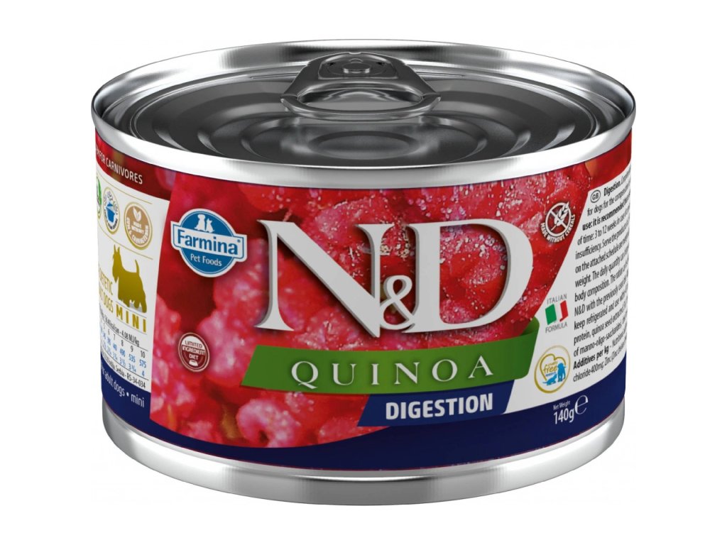 Konzerva s kompletním krmivem N&D QUINOA DIGESTION (výrobce: Farmina) je určena pro dospělé psy. Speciální vysoce stravitelná vlhká receptura krmiv N&D pro zdraví trávicího traktu. Receptura Lamb & Fennel obsahuje cenné nutraceutikum v podobě fenyklu (nápomocný při vstřebávání živin; omezení fermentace = méně střevních plynů; zdroj flavonoidů s antioxidačními účinky).