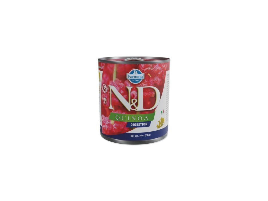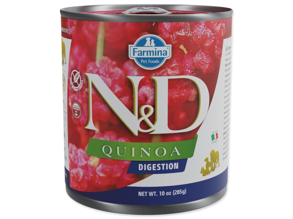 Kompletní vlhké krmivo pro dospělé psy. Farmina N&D Quinoa Digestion je krmivo pro zvláštní účely výživy určené k podpoře při poruchách trávení a exokrinní pankreatické nedostatečnosti.