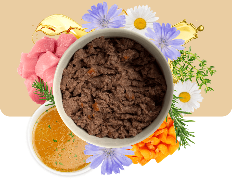 | Složení: | Heřmánek, Krůtí a krocaní maso, Mrkev, Olej z lněného semínka, Rozmarýn, Tymián, Vývar |