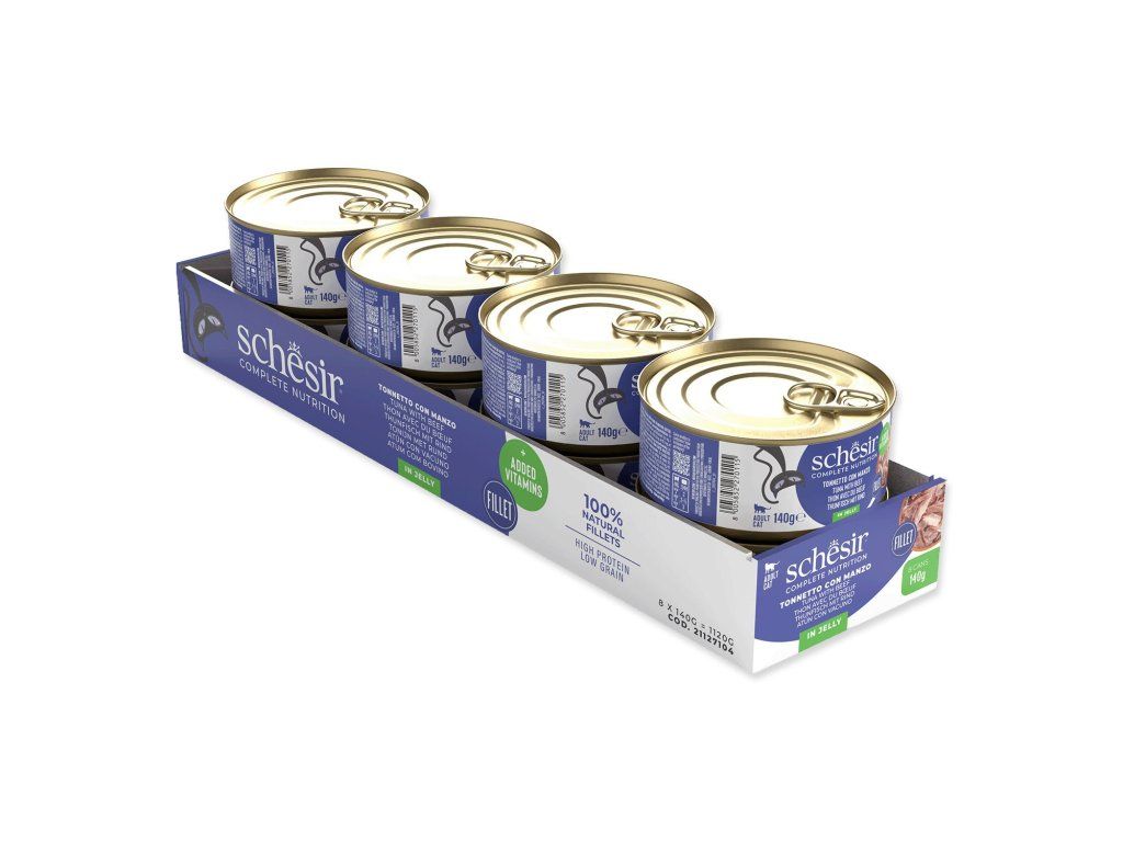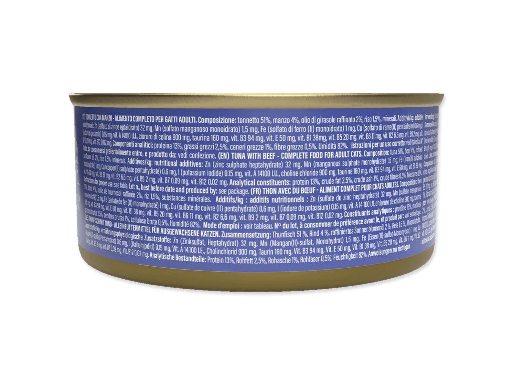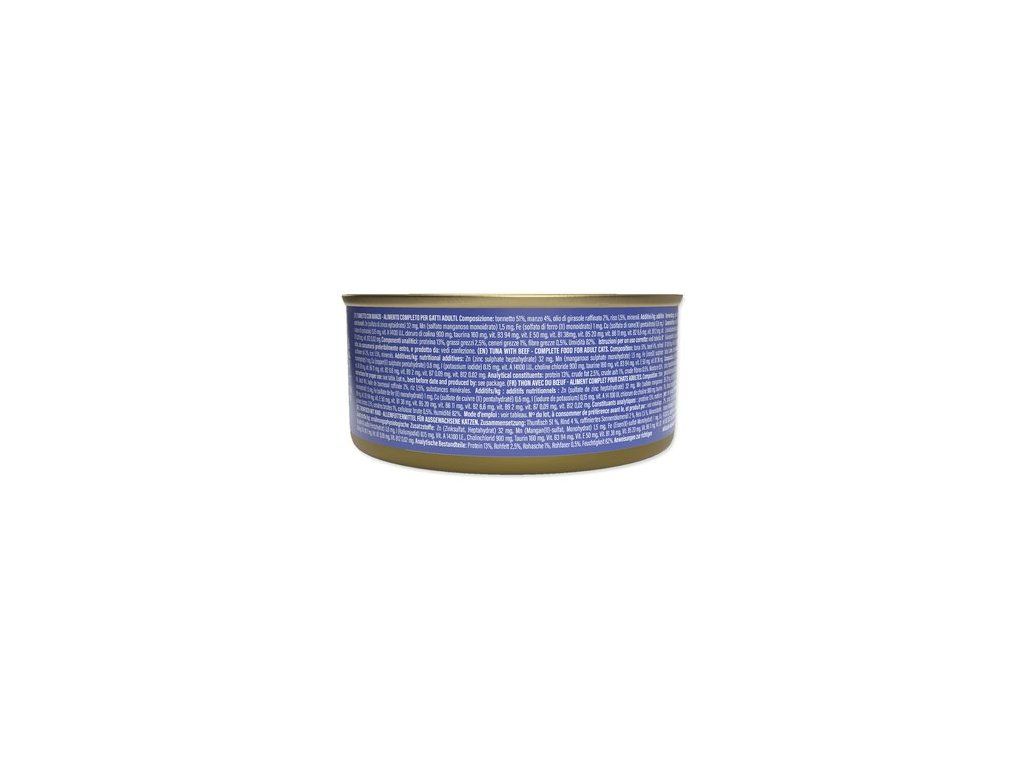 Konzerva s masem z tuňáka a hovězími filetami. Doplňkové krmivo pro dospělé kočky.