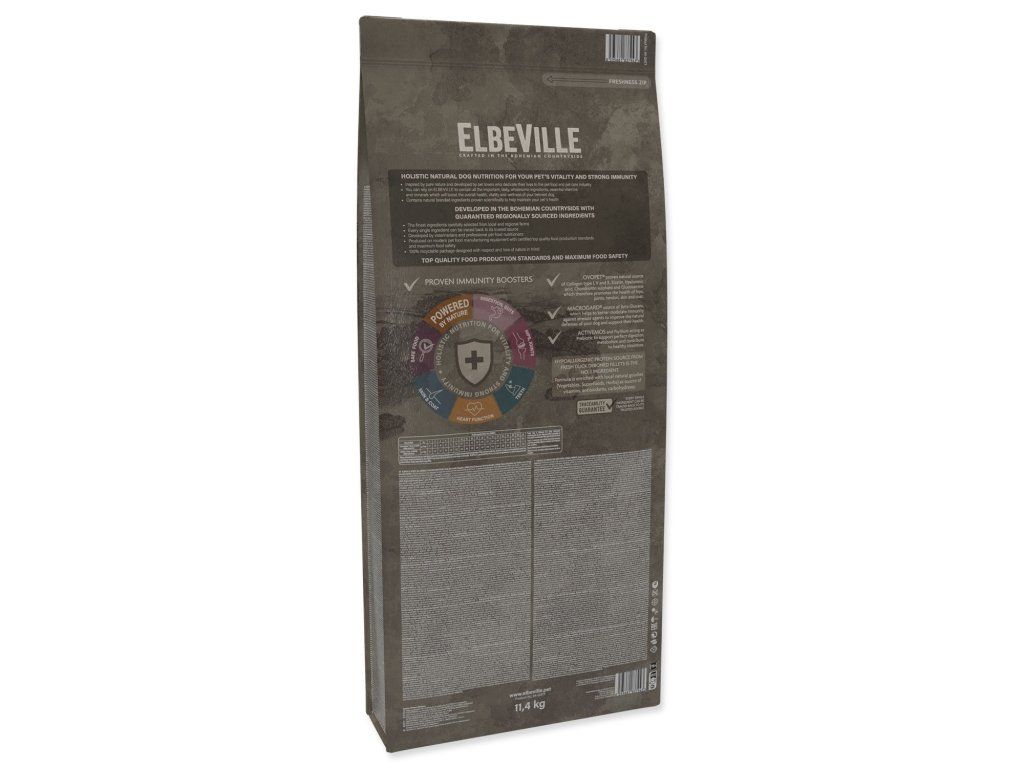 ELBEVILLE je přirozená strava pro celkové zdraví Vašeho psa. Je vyrobená z nejlepších přírodních, lokálních surovin včetně tzv. superpotravin a s vysokým obsahem kvalitního čerstvého masa. Tato receptura obsahuje 35 % čerstvých vykostěných filetů z kachny a dále 28 %