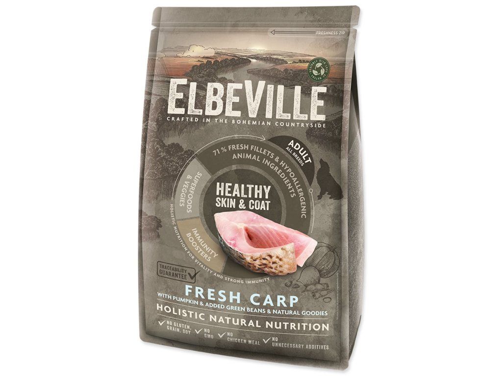 ELBEVILLE je přirozená strava pro celkové zdraví Vašeho psa. Je vyrobená z nejlepších přírodních, lokálních surovin včetně tzv. superpotravin a s vysokým obsahem kvalitního čerstvého masa. Tato receptura obsahuje 35 % čerstvých vykostěných filetů z kapra a dále 28 %