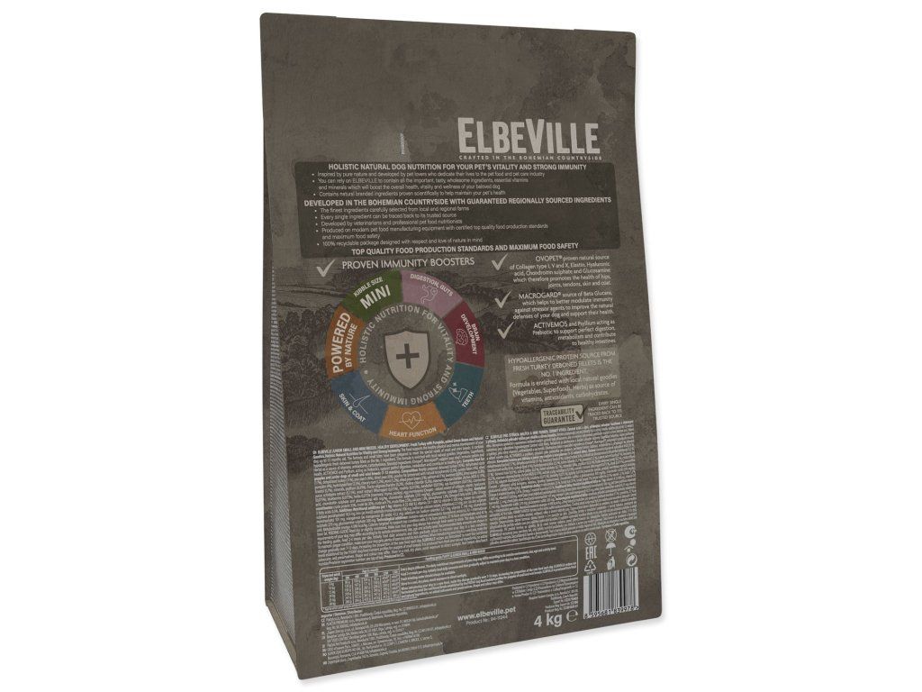 ELBEVILLE je přirozená strava pro celkové zdraví Vašeho psa. Je vyrobená z nejlepších přírodních, lokálních surovin včetně tzv. superpotravin a s vysokým obsahem kvalitního čerstvého masa. Tato receptura obsahuje 35 % čerstvých vykostěných filetů z krůty a dále 28 %