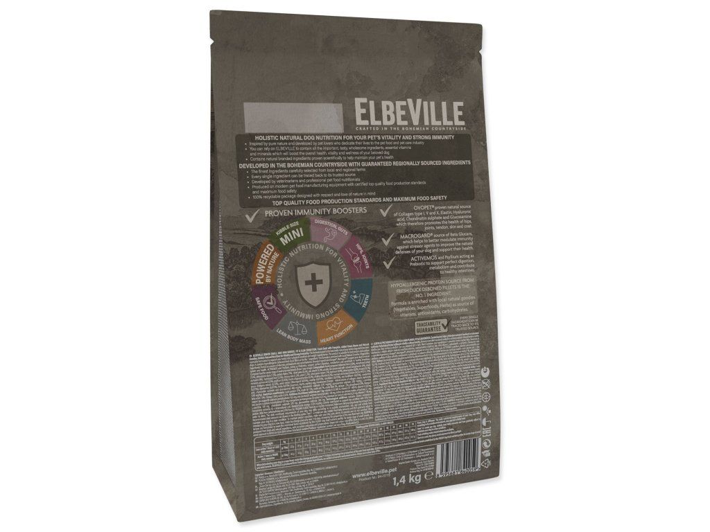 ELBEVILLE je přirozená strava pro celkové zdraví Vašeho psa. Je vyrobená z nejlepších přírodních, lokálních surovin včetně tzv. superpotravin a s vysokým obsahem kvalitního čerstvého masa. Tato receptura obsahuje 35 % čerstvých vykostěných filetů z kachny a dále 27 %