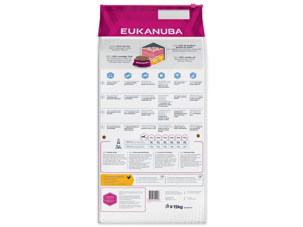 Toto krmivo Eukanuba obsahuje nižší množství tuku a poskytuje optimální denní dávku proteinů, karbohydrátů, důležitých vitamínů a minerálů pro zdraví a pohodu vašeho psa. Některé tuky byly nahrazeny karbohydráty s nižším obsahem kalorií, aniž by došlo ke ztrátě výživové hodnoty. Obsahuje přísady vysoké kvality a velké množství živočišných proteinů. 100% kompletní a vyvážená strava pro dospělé psy malých a středně velkých plemen, kteří mají nadváhu nebo jsou méně aktivní.