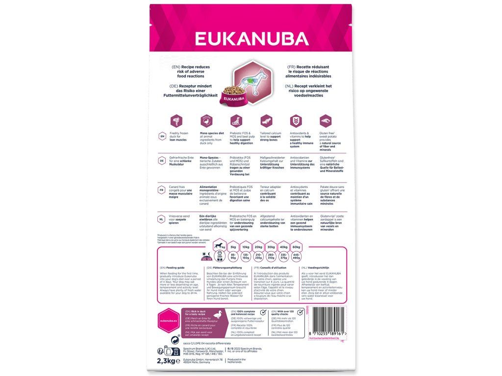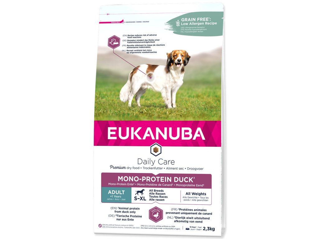 Suché krmivo Eukanuba Daily Care pro dospělé psy – monoproteinové krmivo bohaté na čerstvě zmrazenou kachnu. Receptura s nízkým obsahem alergenů s jediným zdrojem živočišných bílkovin. Seznam složek této receptury je dosti stručný a všechny živočišné složky v této jednodruhové stravě pocházejí pouze z kachny, aby se snížilo riziko nežádoucích reakcí na krmivo a podpořily se štíhlé svaly.