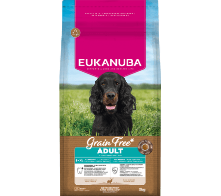 EUKANUBA Grain Free je vyvážené suché krmivo pro dospělé psy všech plemen od 1 roku věku.