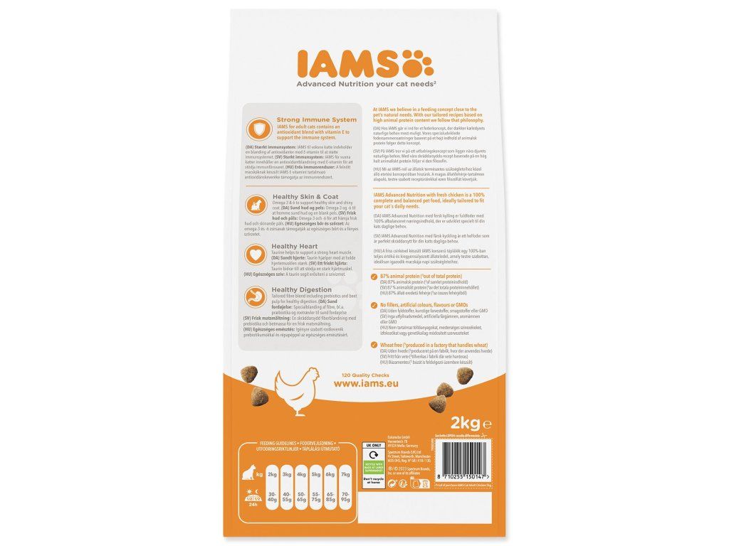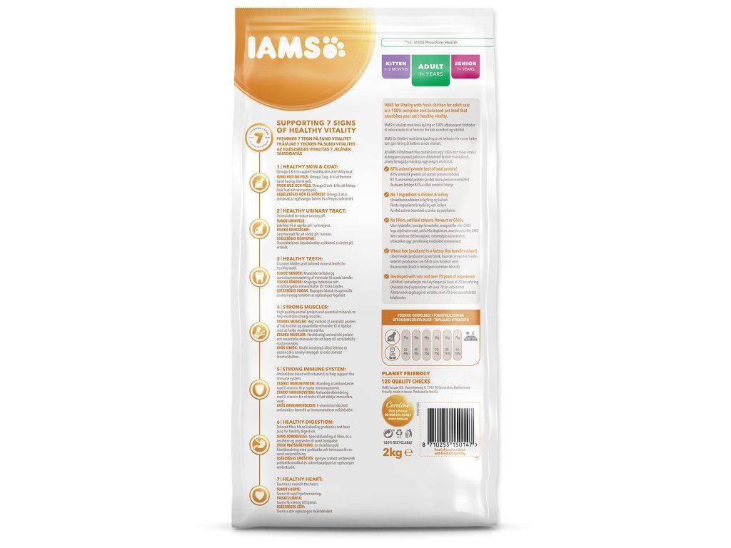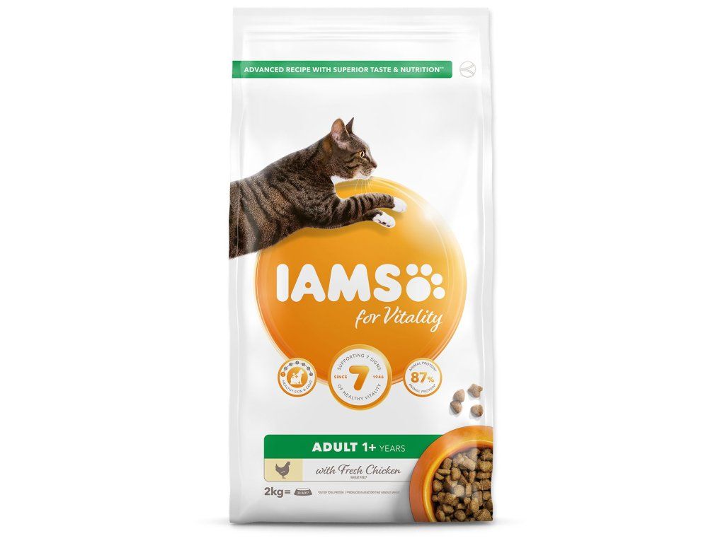 Krmivo IAMS for Vitality pro dospělé kočky je 100% kompletní a vyvážené, odborníky sestavené krmivo, které bude vašemu zvířeti chutnat a svědčit. Naše nová a vylepšená receptura pro dospělé kočky s čerstvým kuřecím masem je založena na kvalitních živočišných bílkovinách pečlivě vybraných tak, aby podporovaly sedm znaků zdravé vitality kočky. Aby byly kočky zdravé, aktivní a plné energie, obsahují naše lahodné receptury až 87 % živočišných bílkovin (z celkového obsahu bílkovin).