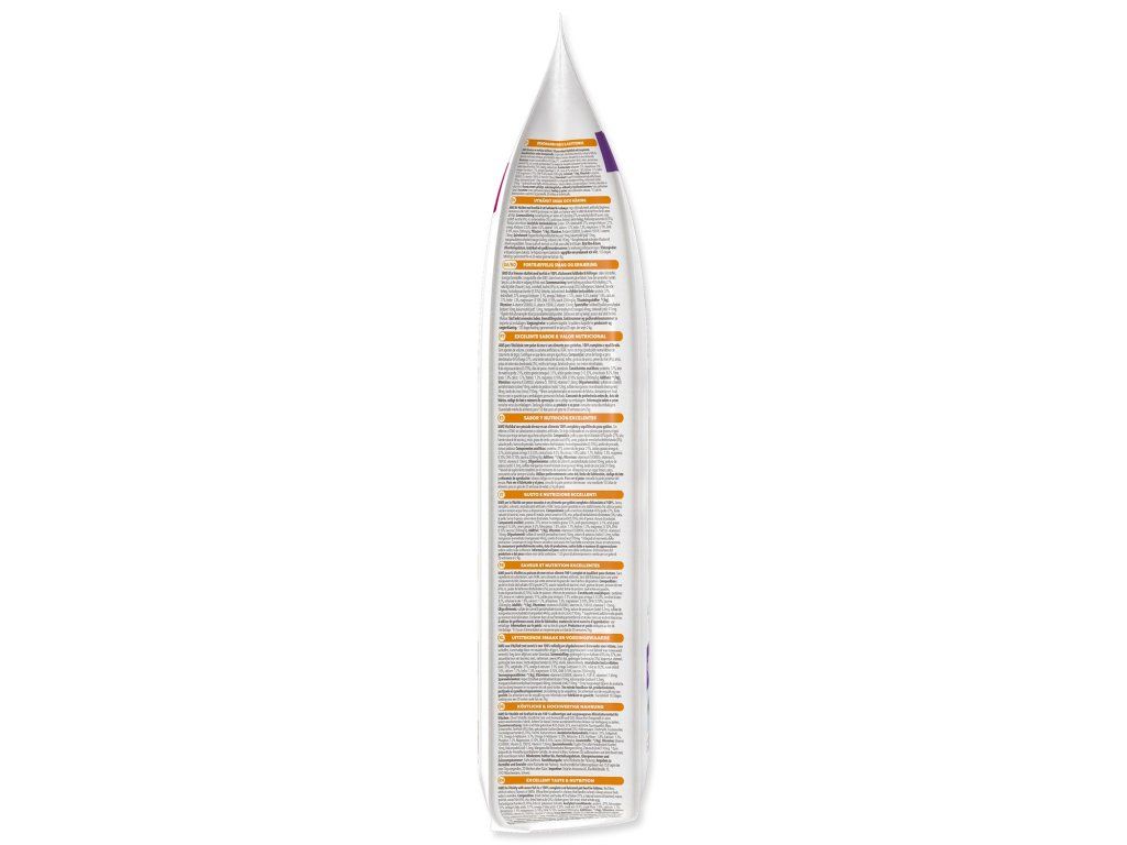 Sušené kuřecí a krůtí 45% (kuřecí 27%, přirozený zdroj taurinu), kukuřice, vepřový tuk, mořské ryby (4%), rýže, sušená řepná dužina (3%), kuřecí šťáva, rybí moučka, sušená celá vejce, fruktooligosacharidy (0,70%), rybí tuk, chlorid draselný.