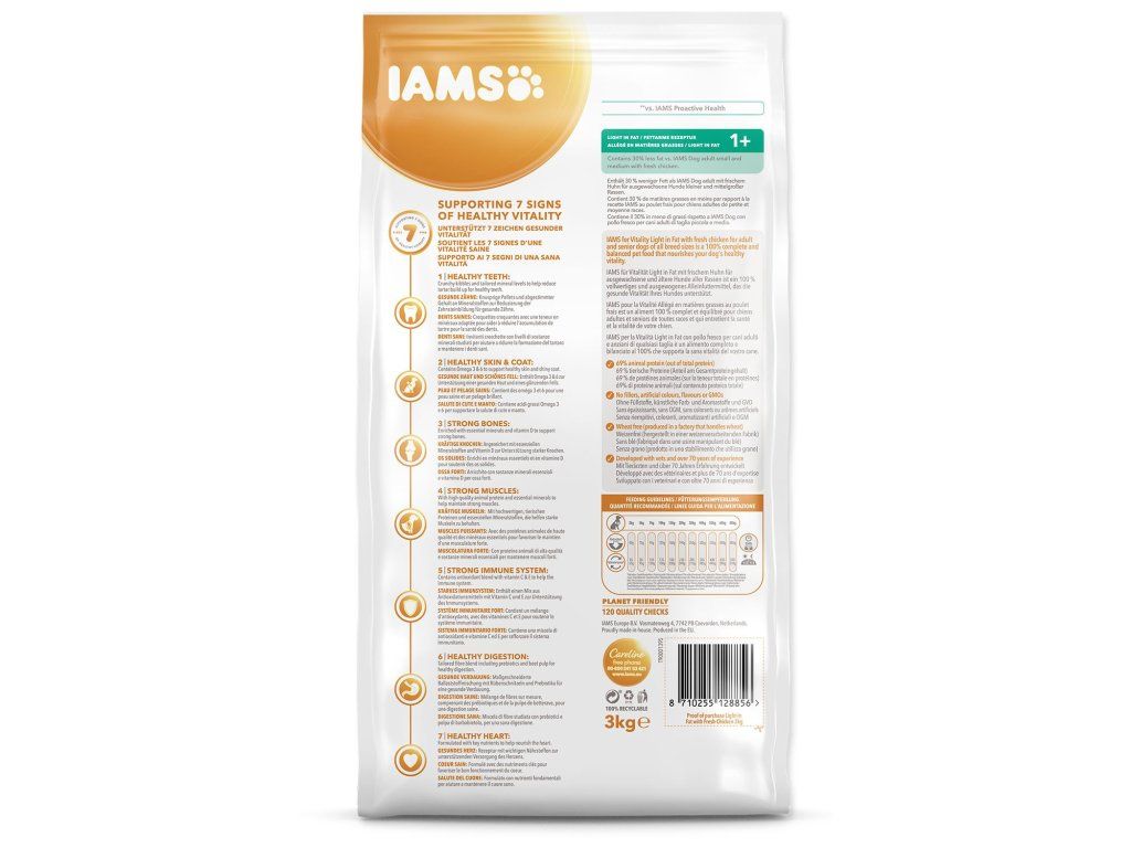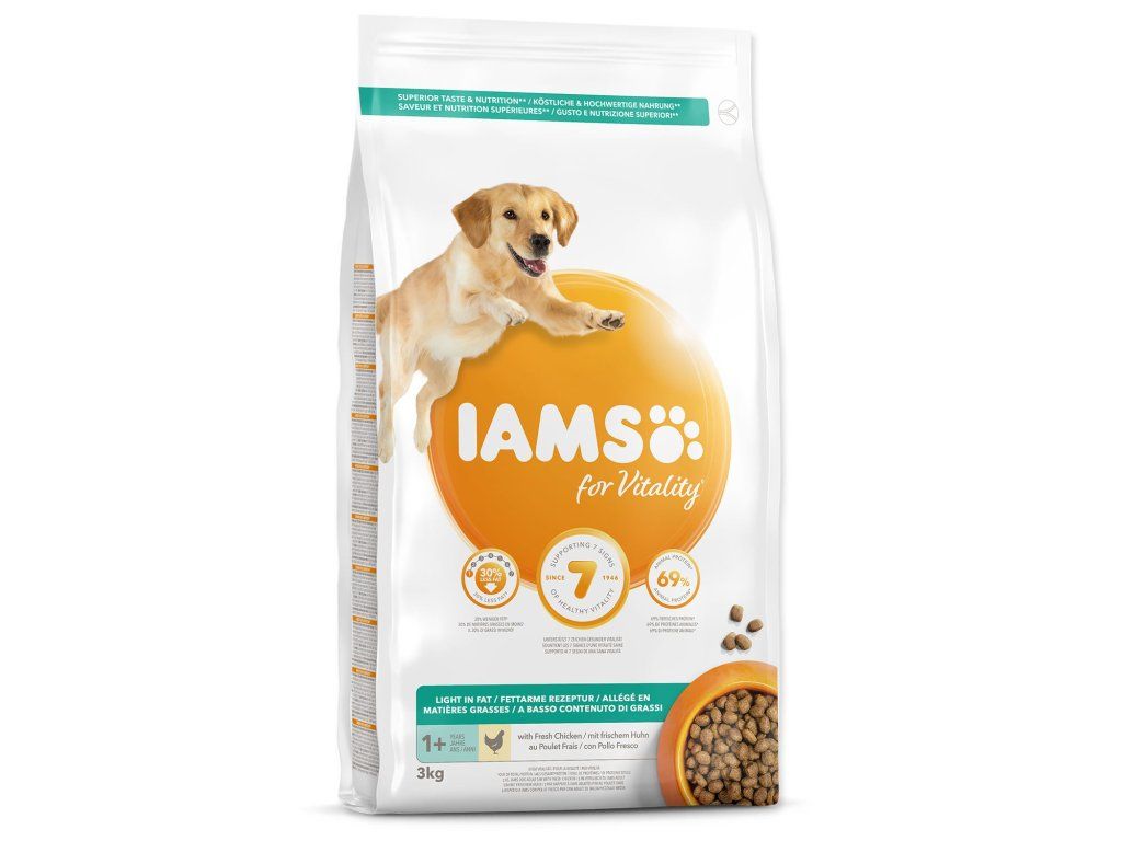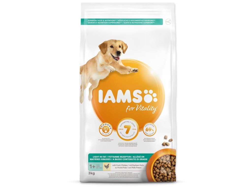 Krmivo IAMS for Vitality s nízkým obsahem tuku pro dospělé psy a psí seniory všech plemen je 100% kompletní a vyvážené, odborníky sestavené krmivo, které bude vašemu zvířeti chutnat a svědčit. Naše nová a vylepšená receptura s čerstvým kuřecím masem je založena na pečlivě vybraných, kvalitních živočišných bílkovinách, které podporují sedm znaků zdravé vitality psa. Aby byl váš pes zdravý, aktivní a plný energie, obsahují naše lahodné receptury až 69 % živočišných bílkovin (z celkového obsahu bílkovin). Naše receptura s nízkým obsahem tuku a pro kastrovaná zvířata skvěle pomáhá regulovat hmotnost psa.