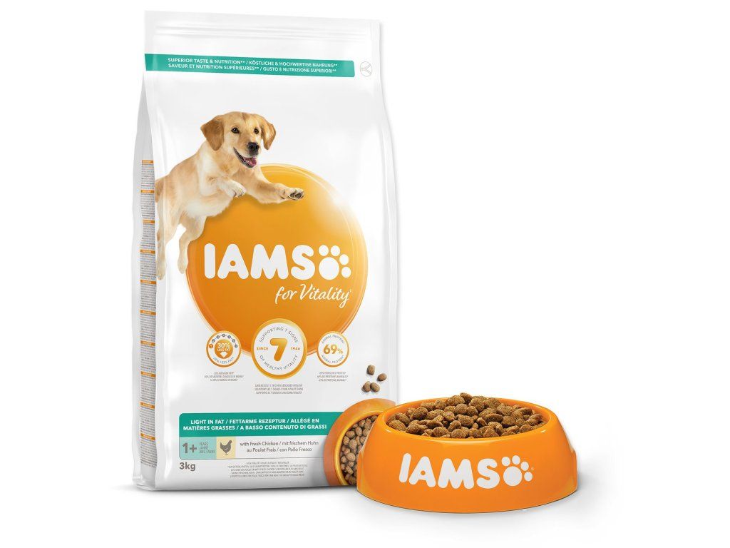 Naším závazkem je dopřát psům specializované krmivo se skvělou chutí, které si váš domácí mazlíček bezvýhradně zamiluje a které bude podporovat všech sedm znaků zdravé vitality. Oproti krmivu IAMS pro dospělé psy s čerstvým kuřecím masem obsahuje tato receptura o 30 % méně tuku než naše běžná receptura pro dospělé psy, takže přispívá k udržení zdravé tělesné hmotnosti. Křupavé granule a optimální hladina minerálů pečuje o zdraví psích zubů a snižuje vznik zubního kamene.