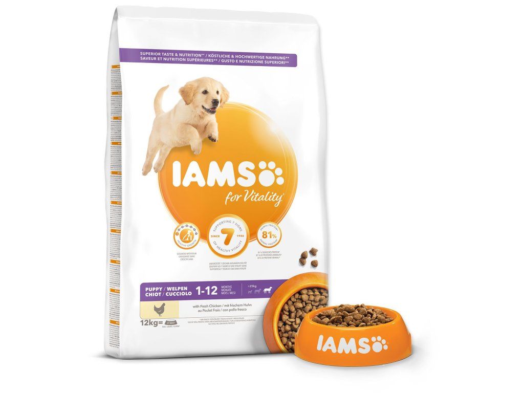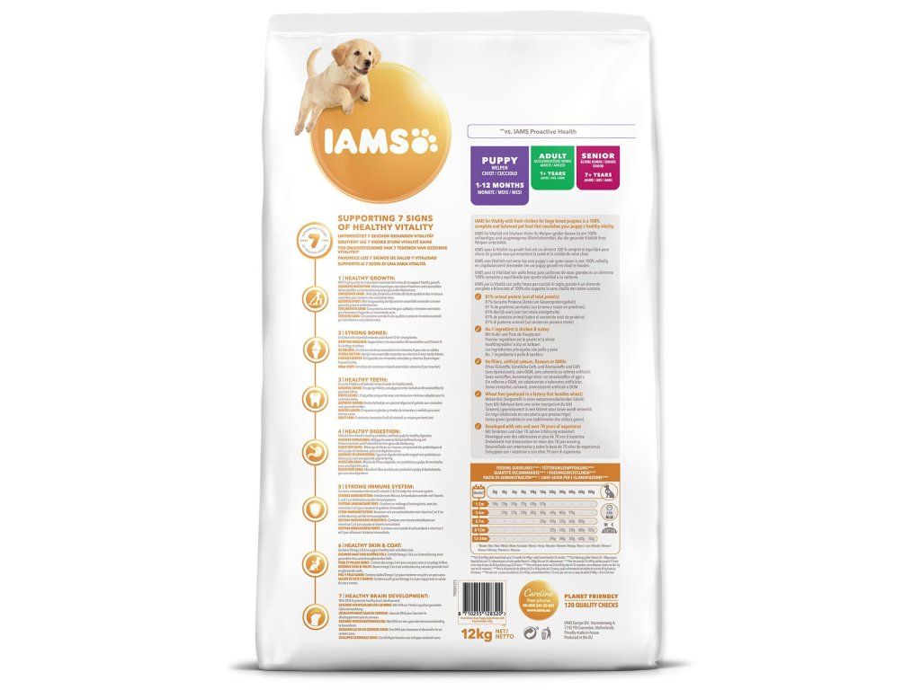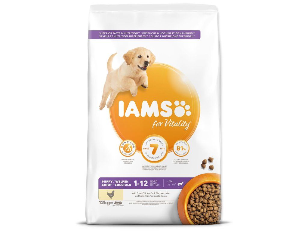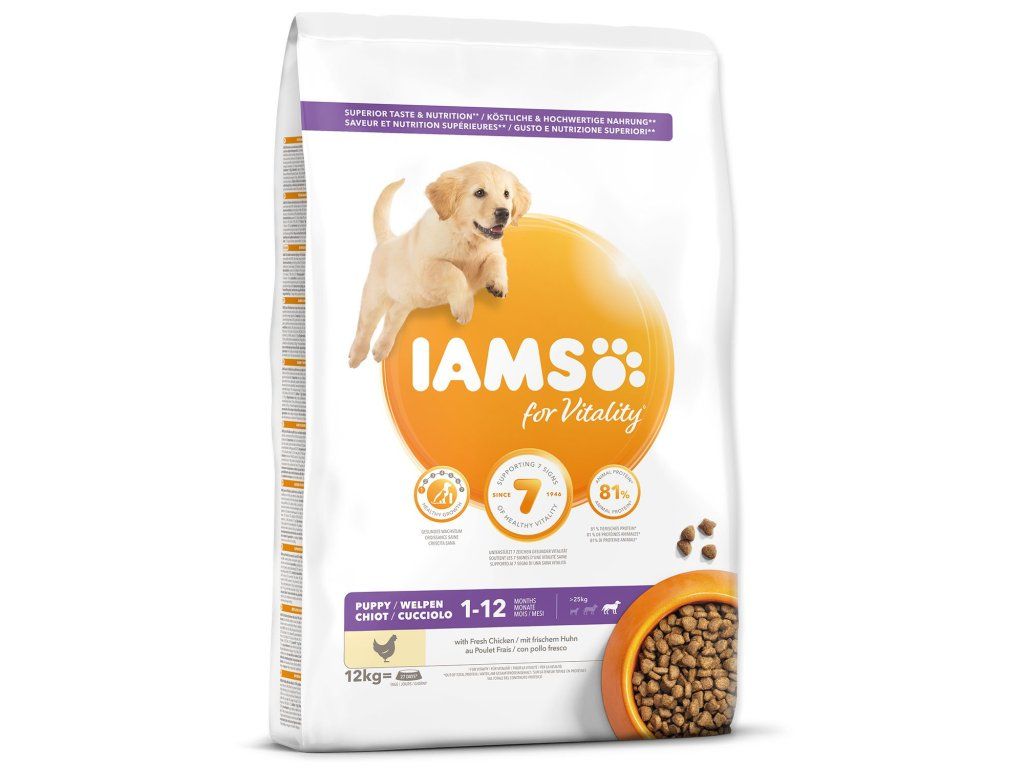 Krmivo IAMS for Vitality pro štěňata velkých plemen je 100% kompletní a vyvážené odborníky sestavené krmivo, které bude vašemu štěněti svědčit. Naše nová a vylepšená receptura pro štěňata s čerstvým kuřecím masem je založena na kvalitních živočišných bílkovinách, které byly pečlivě vybrány, aby podporovaly sedm znaků zdravé vitality štěněte. Aby byla štěňata zdravá, aktivní a plná energie, obsahují naše lahodné receptury až 81 % živočišných bílkovin z kuřecího masa (z celkového obsahu bílkovin).