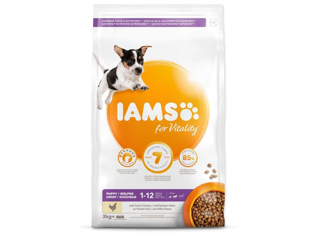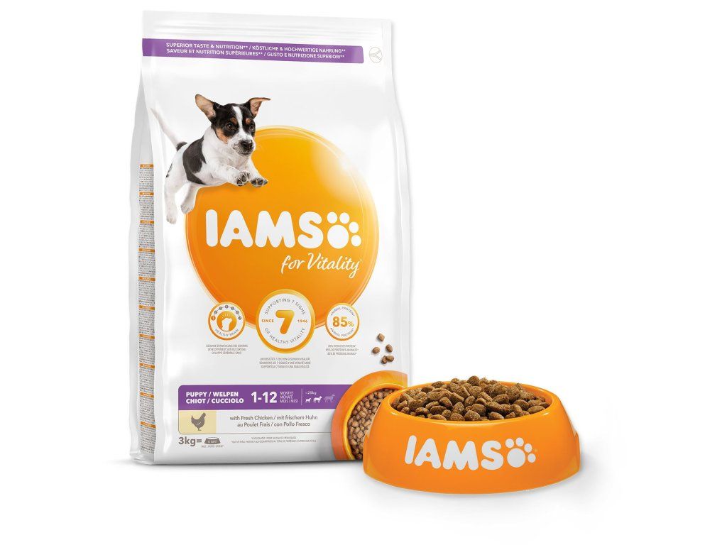 Krmivo IAMS for Vitality pro štěňata malých a středních plemen je 100% kompletní a vyvážené odborníky sestavené krmivo, které bude vašemu štěněti svědčit. Naše nová a vylepšená receptura pro štěňata s čerstvým kuřecím masem je založena na kvalitních živočišných bílkovinách, které byly pečlivě vybrány, aby podporovaly sedm znaků zdravé vitality štěněte. Aby byla štěňata zdravá, aktivní a plná energie, obsahují naše lahodné receptury až 85 % živočišných bílkovin z kuřecího masa (z celkového obsahu bílkovin).