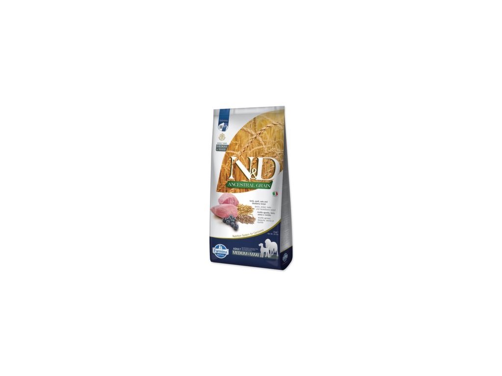 Krmivo N&D Dog Adult Medium & Maxi Ancestral Grain Lamb, Spelt, Oats & Blueberry 12kg