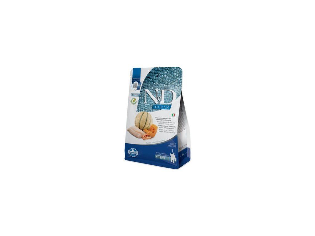 Kompletní krmivo N&D Kitten Ocean s treskou, krevetami, dýní a melaunem cantaloupe.