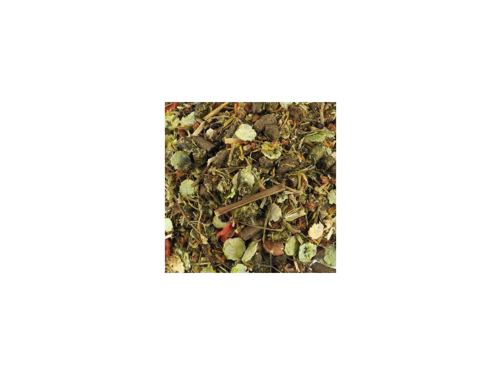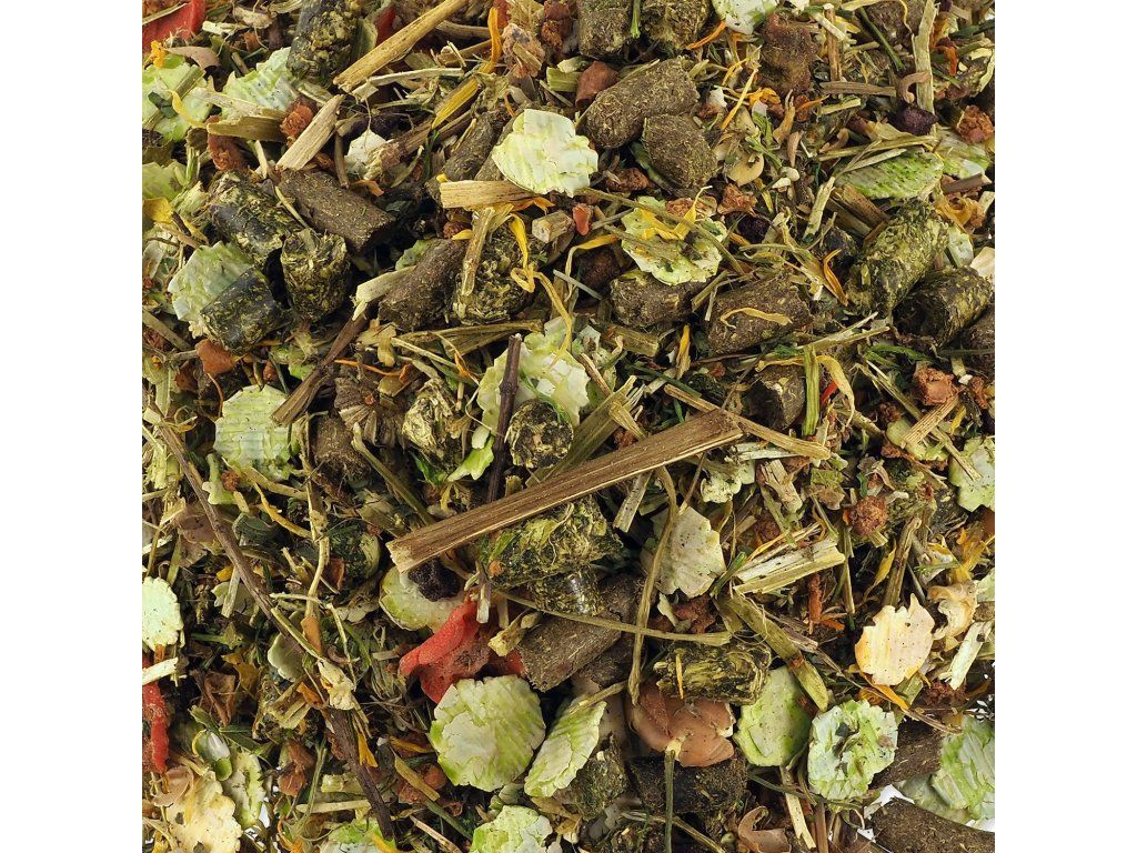 Složení: sušená vegetace rostoucí na trvalých pastvinách podhůří Alp, hrachové vločky 11,4 %, zelenina (sušená mrkev, sušená petržel 2,1 %, sušený pastinák, sušená červená řepa), byliny (sušené květy měsíčku lékařského 2 %, sušené kopřivy, sušená máta peprná 1,1 %, sušená meduňka, sušené pampelišky, sušený heřmánek), sušená jablka 4 %, vločky z bobu obecného 3,3 %, sušená vojtěška, lněná semena, semena černého kmínu, semena fenyklu.