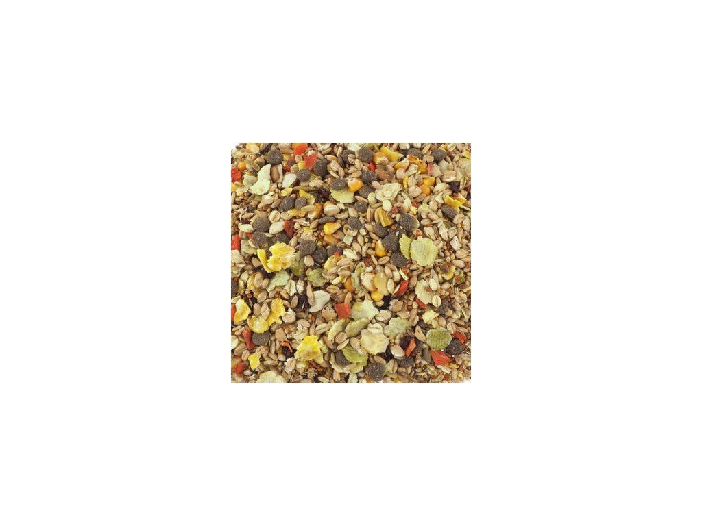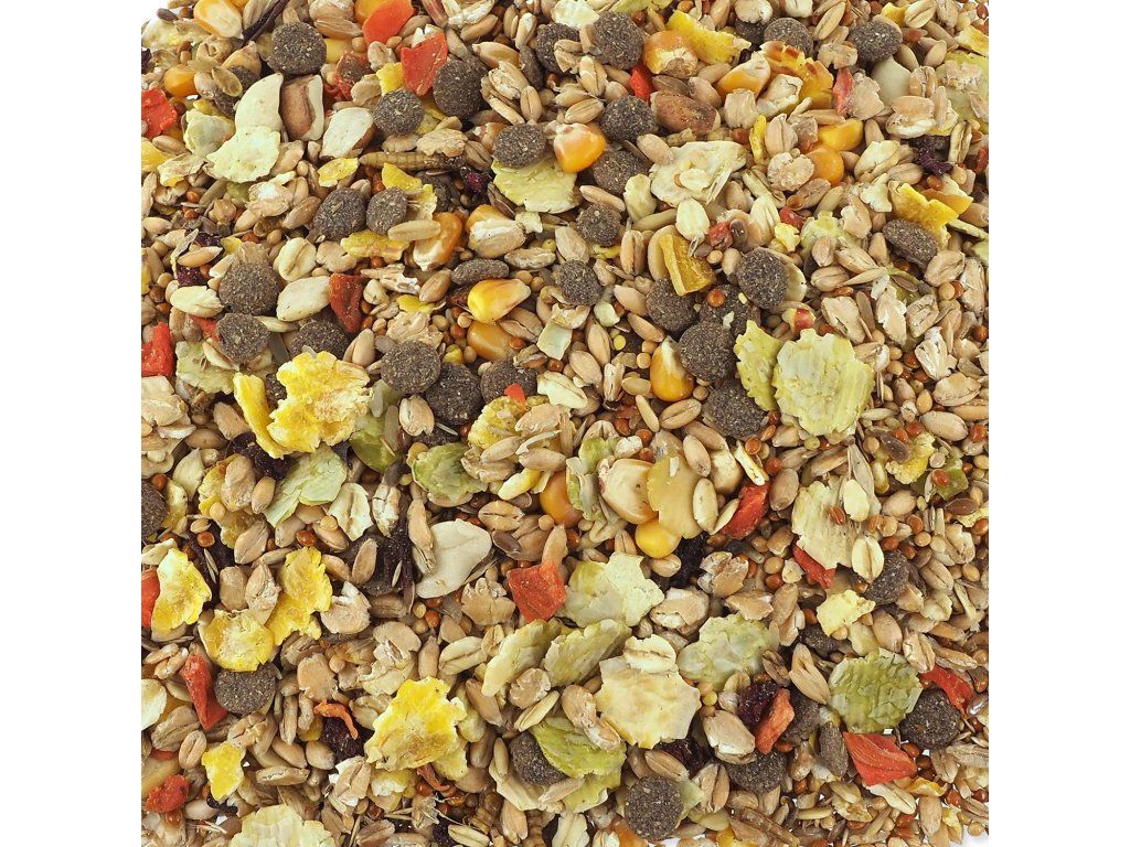 Složení: pšeničné vločky, proso mana, proso la plata 14 %, kukuřice 9 %, hrachové vločky 7 %, pšenice, kukuřičné vločky, ovesné vločky, zelenina (sušená mrkev, sušená červená řepa), semena travin, arašídy, rýže, maso (sušené hovězí 0,9 %, sušené kuřecí 0,9 %, sušené ryby), extrudovaná kukuřičná mouka, lněné semeno, špalda, oves, sušení mouční červi.