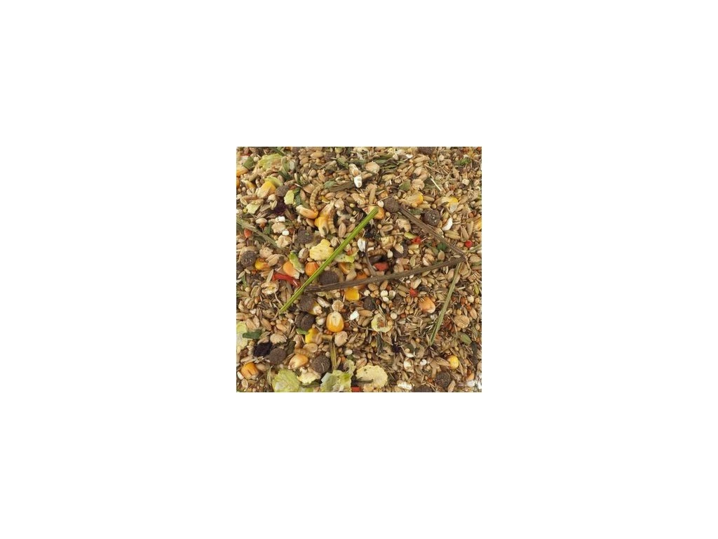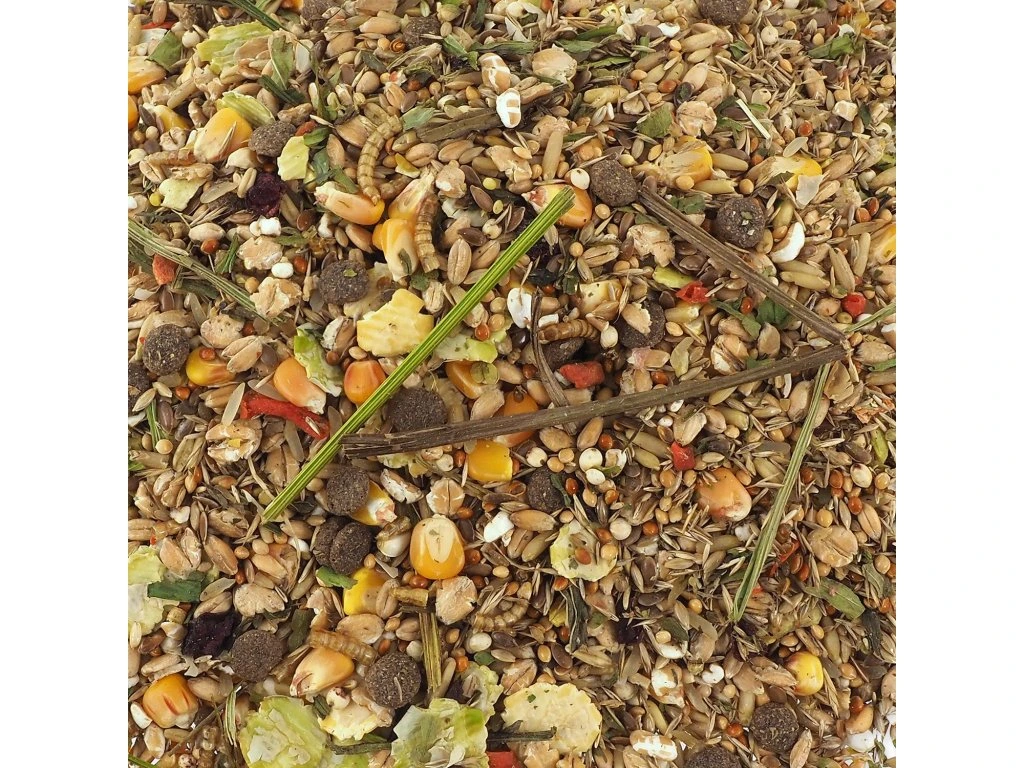 Složení: pšenicné vločky, proso la plata, kukuřice 13 %, oves, proso mana, hrachové vločky, pšenice 6 %, rýže, semena kanárských trav, semena travin, čirok dvoubarevný, sušený artyčok, maso (sušené kuřecí, sušené hovězí 0,9 %, sušené ryby), extrudovaná kukuřičná mouka, zelenina (sušená mrkev, sušená červená řepa 1 %), lněné semeno, špalda, pšeničné pukance, sušený jitrocel, sušení mouční červi 0,5 %.