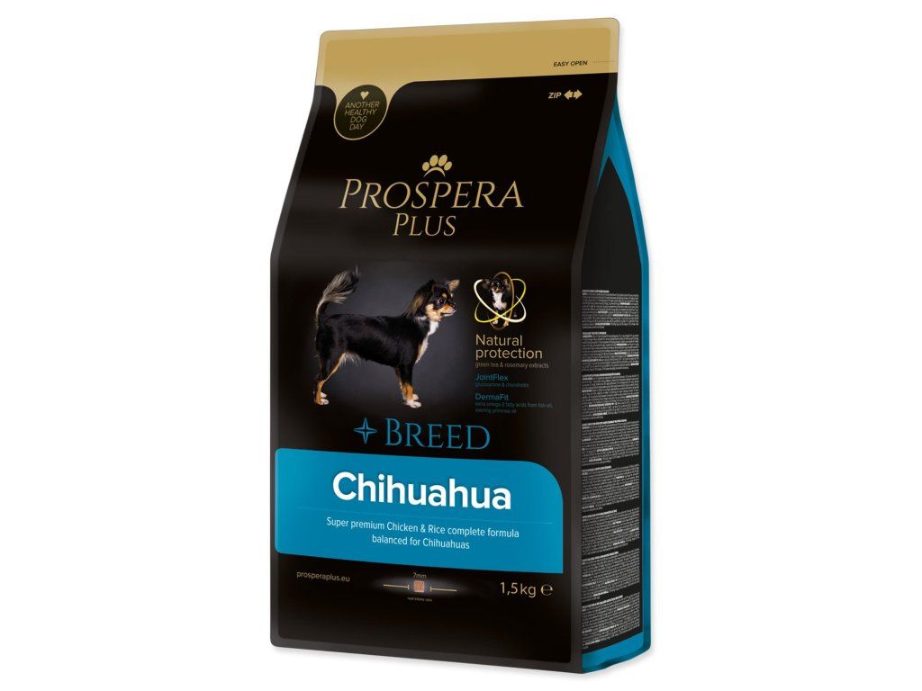 PROSPERA PLUS Chihuahua je superpremiové krmivo, navržené s ohledem na unikátní výživové potřeby plemene Čivava. Základem receptury je kvalitní lehce stravitelné kuřecí maso doplněné o funkční přísady extraktu ze zeleného čaje a rozmarýnu které posilují imunitu pejsků. Krmivo je obohaceno o rybí tuk (omega 3 mastné kyseliny) a pupalkový olej, které podporují zdravou srst tohoto plemene. Chondroprotektiva glukosamin a chondroitin pomáhají posilovat a stabilizovat kosti a klouby. Speciální tvar granulí pomáhá k prevenci před zubním kamenem a plakem.