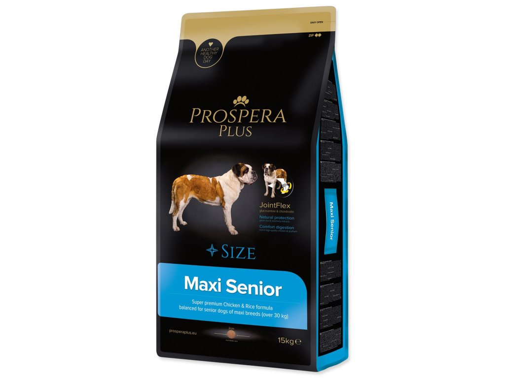 PROSPERA PLUS Maxi Senior je superpremiové krmivo, které je přizpůsobeno tak aby splňovalo měnící se nutriční a fyziologické požadavky starších psů velkých a obřích plemen. Chondroprotektiva glukosamin a chondroitin pomáhají posilovat a stabilizovat kosti a klouby. Krmivo je bohaté na vysoce kvalitní a lehce stravitelné kuřecí maso obohacená o psyllium, které podporuje správný metabolismus tuků a pomáhá udržovat správnou hladinu cholesterolu. Ingredience obsažené v receptuře, fruktooligosacharidy a extrakt z kvasnic, posilují imunitu vašeho psa. Přírodní Omega 3 mastné kyseliny z rybího tuku společně s pupalkovým olejem zase přispívají ke zdravé srsti a krásné kůži.