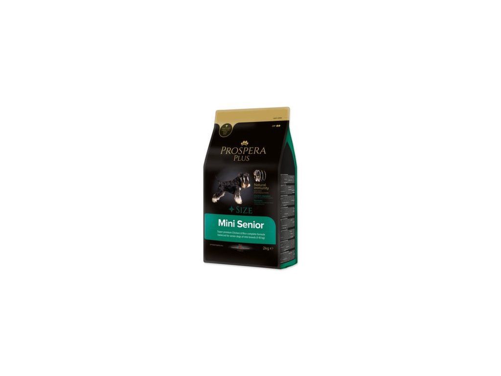 PROSPERA PLUS Mini Senior je superprémiové krmivo bohaté na vysoce kvalitní a lehce stravitelné kuřecí maso. Receptura je přizpůsobena tak, aby splňovala měnící se nutriční a fyziologické požadavky starších psů malých a trpasličích plemen. Ingredience obsažené v receptuře, fruktooligosacharidy a extrakt z kvasnic posilují imunitu Vašeho psa. Přírodní omega-3 mastné kyseliny z rybího tuku společně s pupalkovým olejem zase přispívají ke zdravé kůži a krásné srsti.